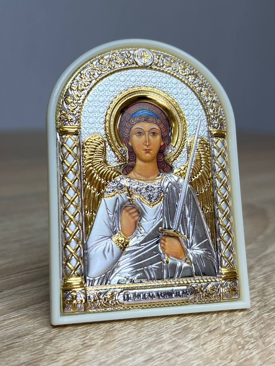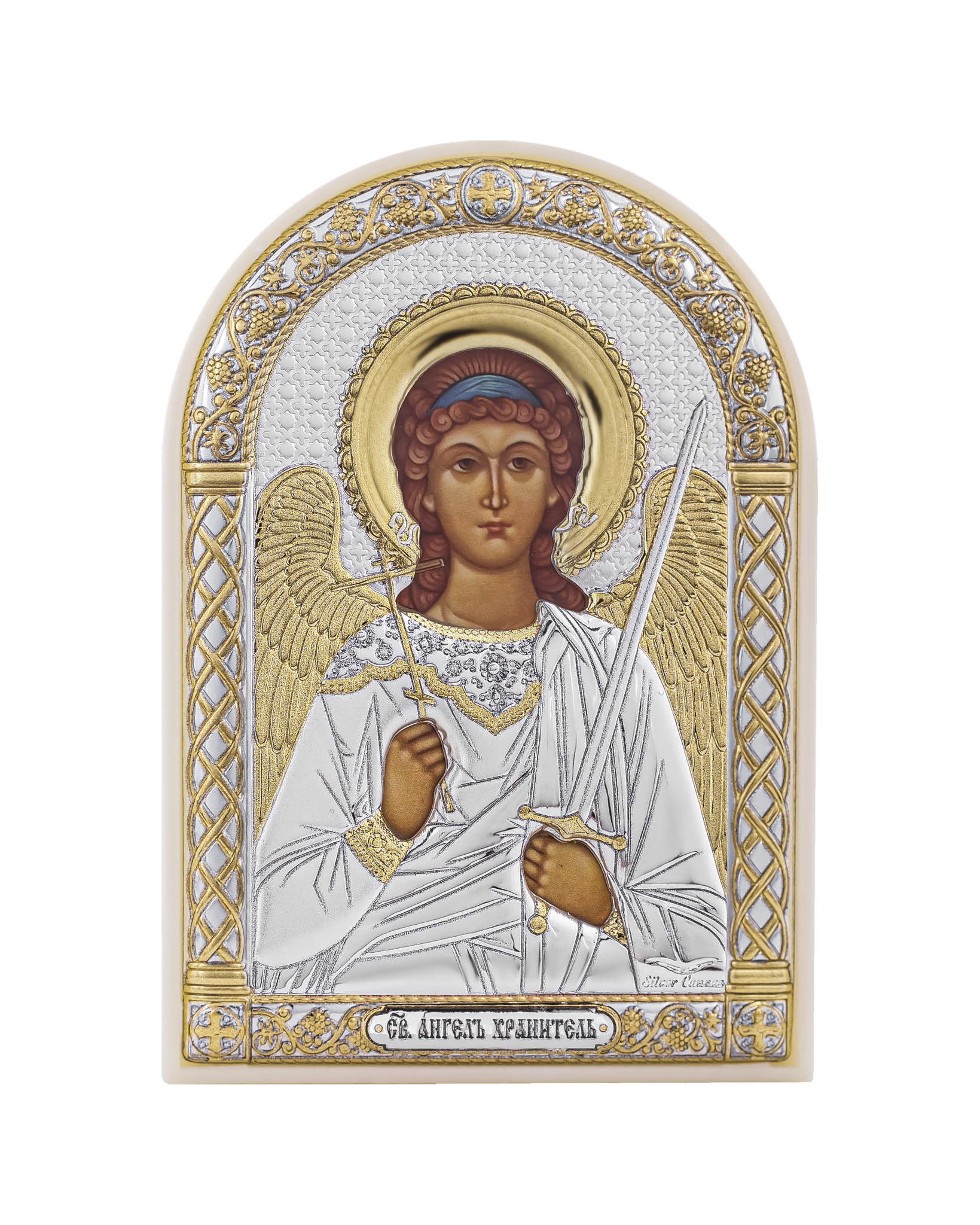 Ангел хранитель, икона арочная, пластик белый 80х115мм. серебряная Греческая.