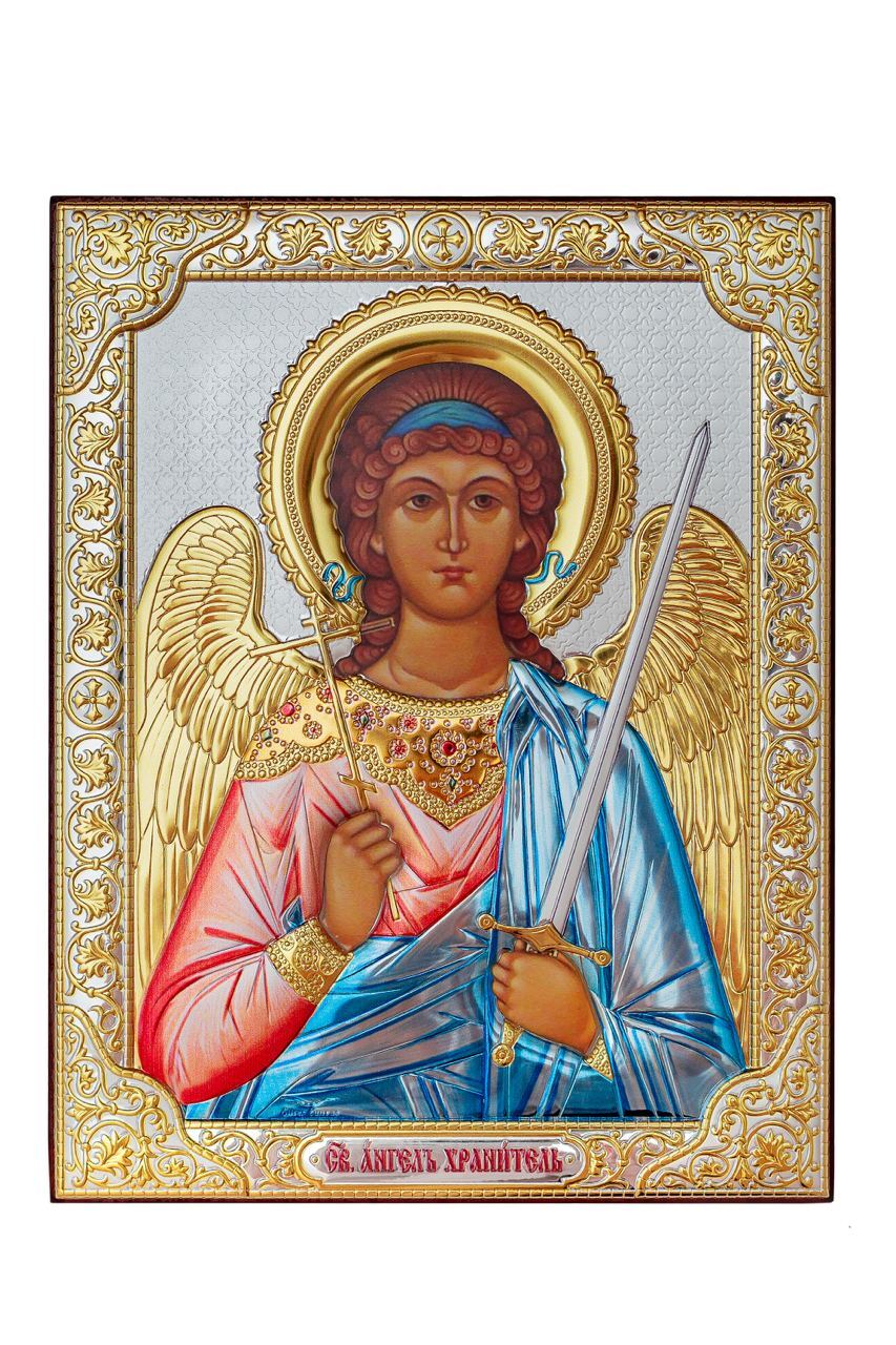 Ангел Хранитель, икона прямоугольная без рамки, красное дерево, эмаль 120х160мм серебряная Греческая.