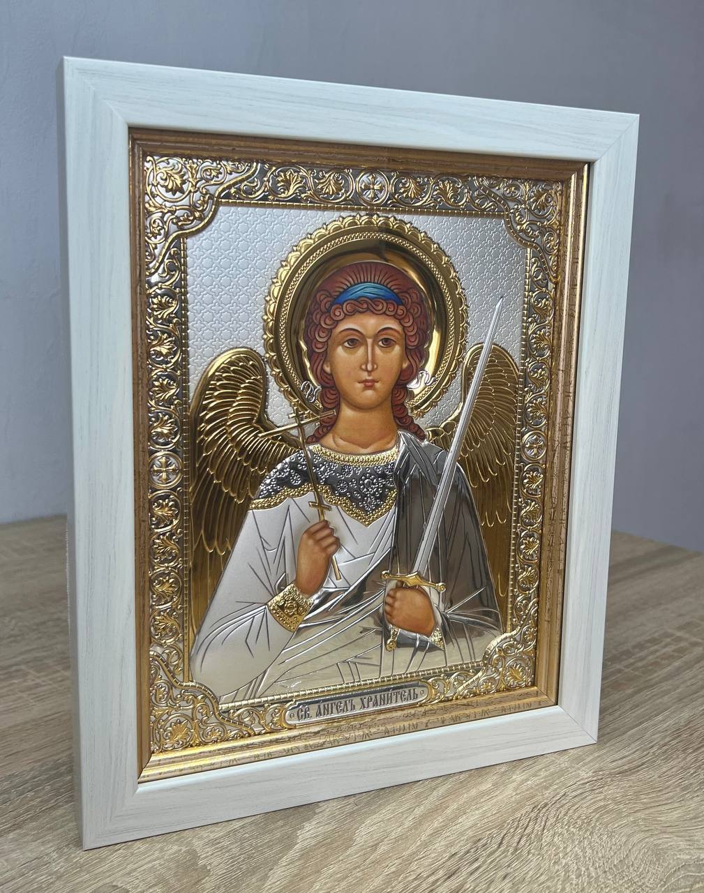 Ангел Хранитель, икона прямоугольная в рамке под стеклом, белое дерево 206х258мм серебряная Греческая.