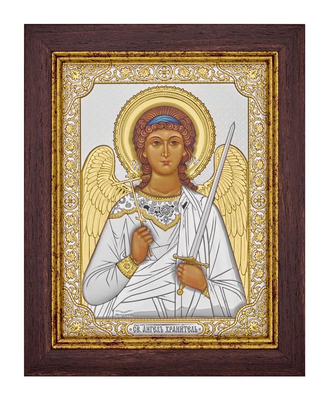 Ангел Хранитель, икона прямоугольная в рамке под стеклом, красное дерево 206х258мм серебряная Греческая.