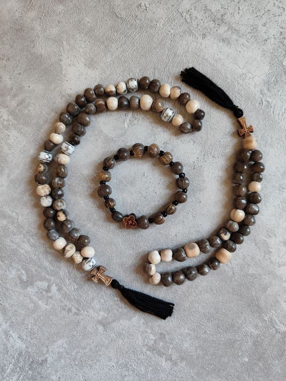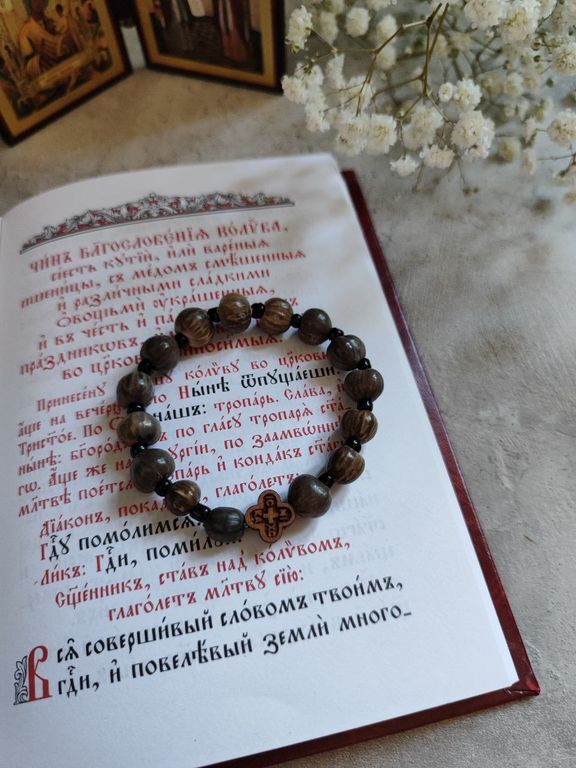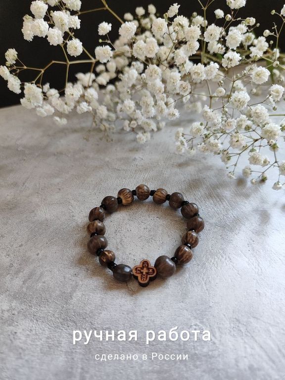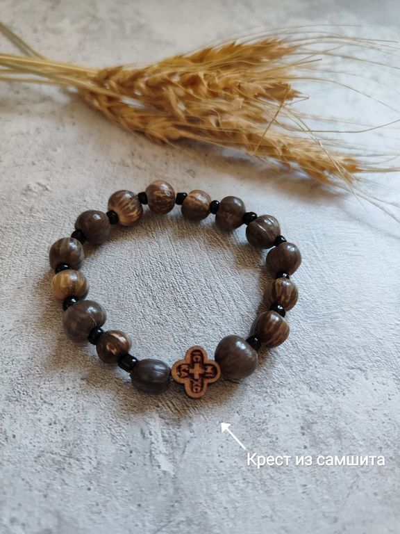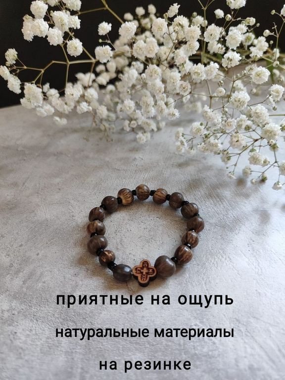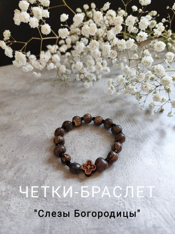 Чётки-браслет "Слёзы Богородицы" собраны вручную из семян бусенника, растения семейства Злаки.Выполнены полностью из натурального природного материала.Цвет бусин уникален, он может быть кремового, серого, темно-коричневого цветов с прожилками. Поверхность бусин гладкая и приятная на ощупь.Крест изготовлен из самшита.Православные четки - это помощник в молитве, прекрасный подарок на именины, крестины или просто для хорошего настроения.Условия хранения: Четки должны храниться в сухом и прохладном месте, чтобы избежать повреждения материала и сохранить их качество. Не мочить!Диаметр бусин примерно 1 см, некоторые чуть больше, некоторые меньше.Диаметр - 18 см. Растяжим.Как использовать: По четкам можно читать любые молитвы. Чтение молитвы сопровождается отсчетом одной бусины после ее завершения.Срок годности: не ограничен.В подарок идет ламинированная икона с молитвой.