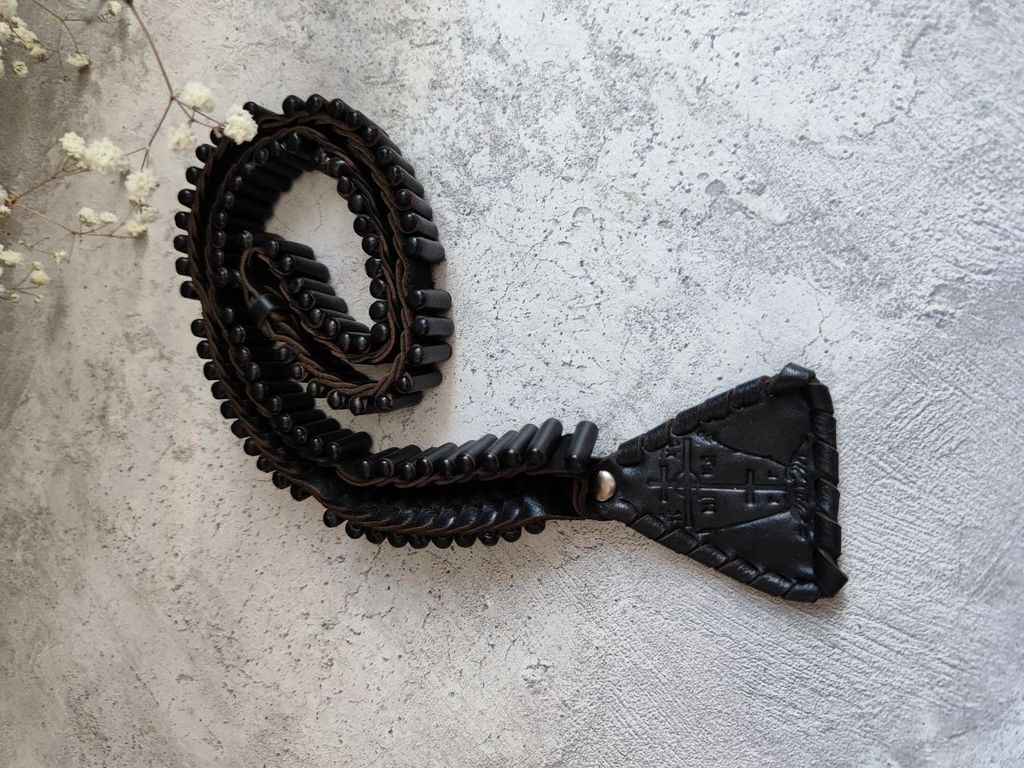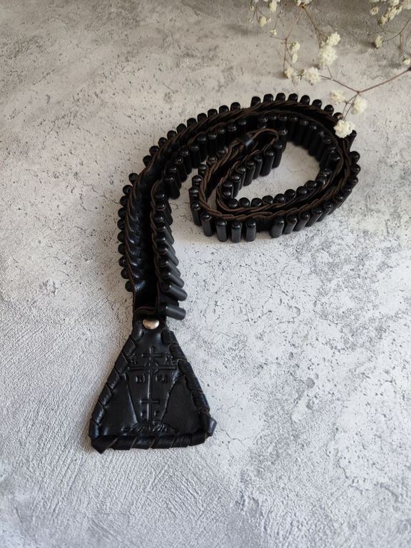 Четки-лестовка, 100 зерен изготовлены в мастерской монастыря. Ручное плетение из натуральной высококачественной кожи. Черный цвет. Длина - 40 см.