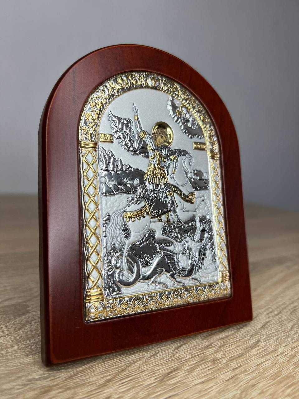 Георгий Победносец, икона арочная, красное дерево 105х140мм серебряная Греческая.