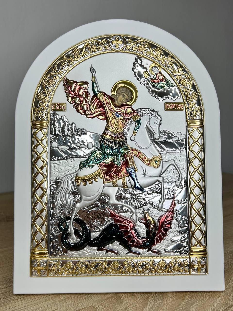 Георгий Победоносец, икона арочная, белое дерево, эмаль 150х200мм серебряная Греческая.