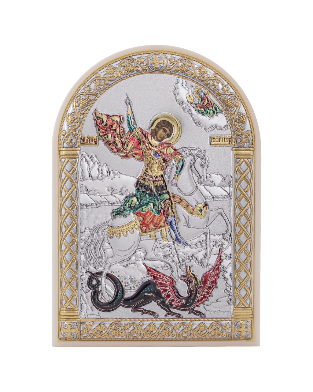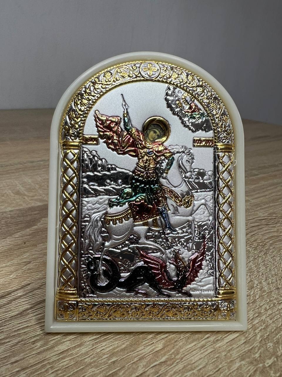 Георгий Победоносец, икона арочная, пластик белый, эмаль 80х115мм серебряная Греческая.