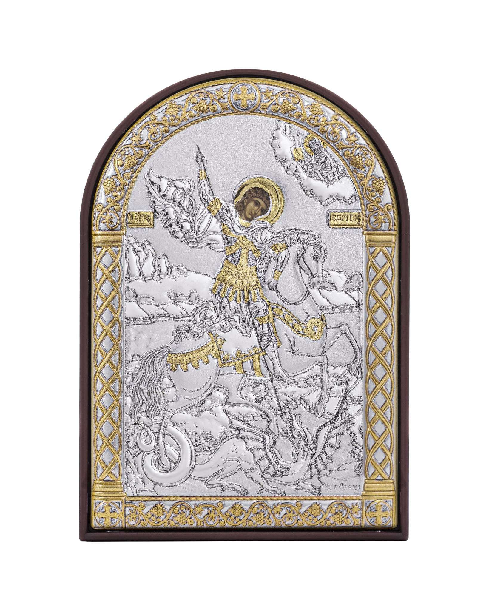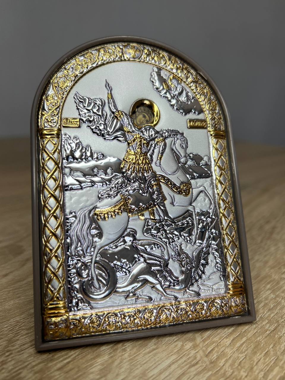Георгий Победоносец, икона арочная, пластик коричневый 80х115мм серебряная Греческая.