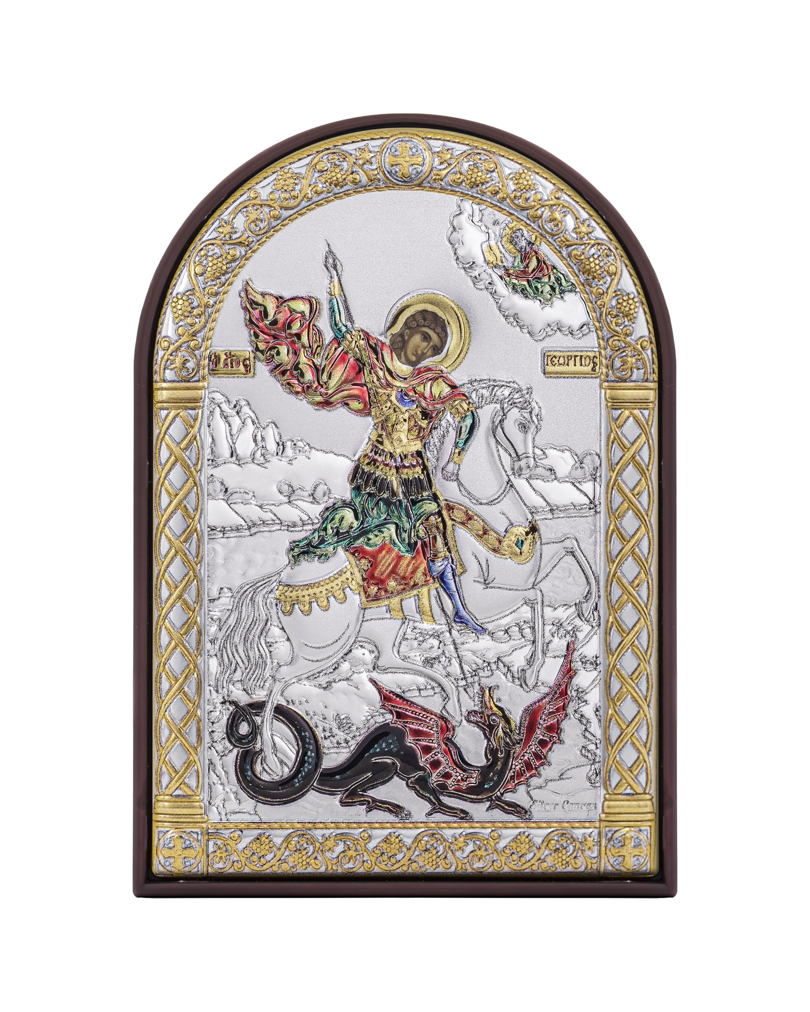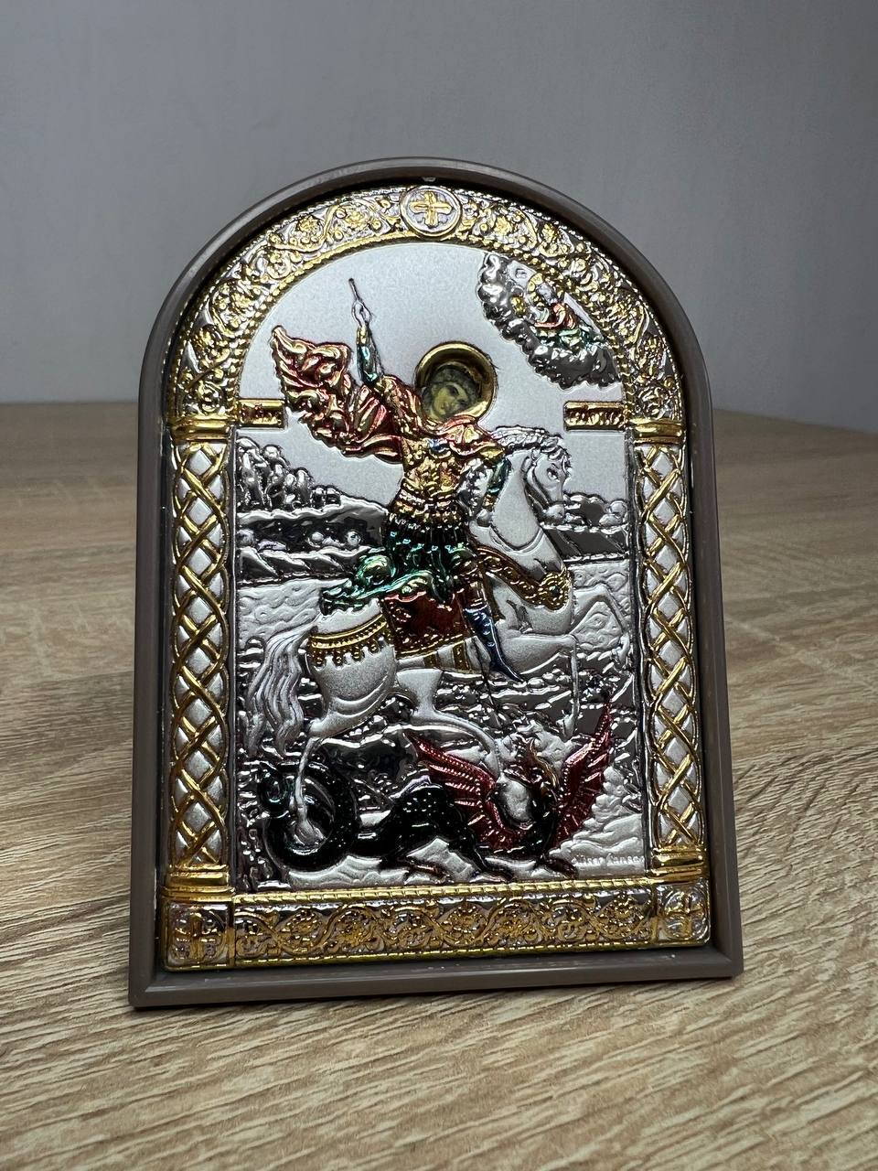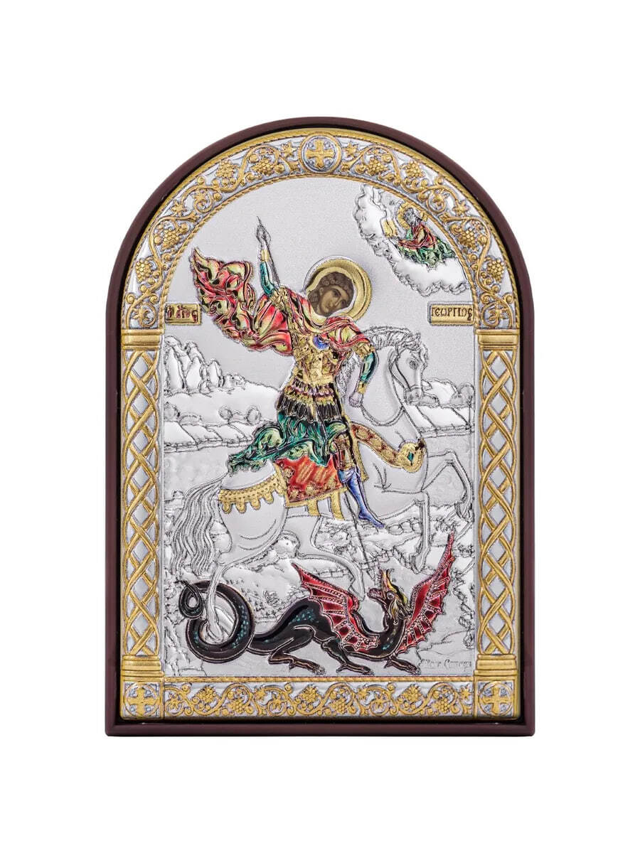 Георгий Победоносец, икона арочная, пластик коричневый, эмаль 80х115мм серебряная Греческая.