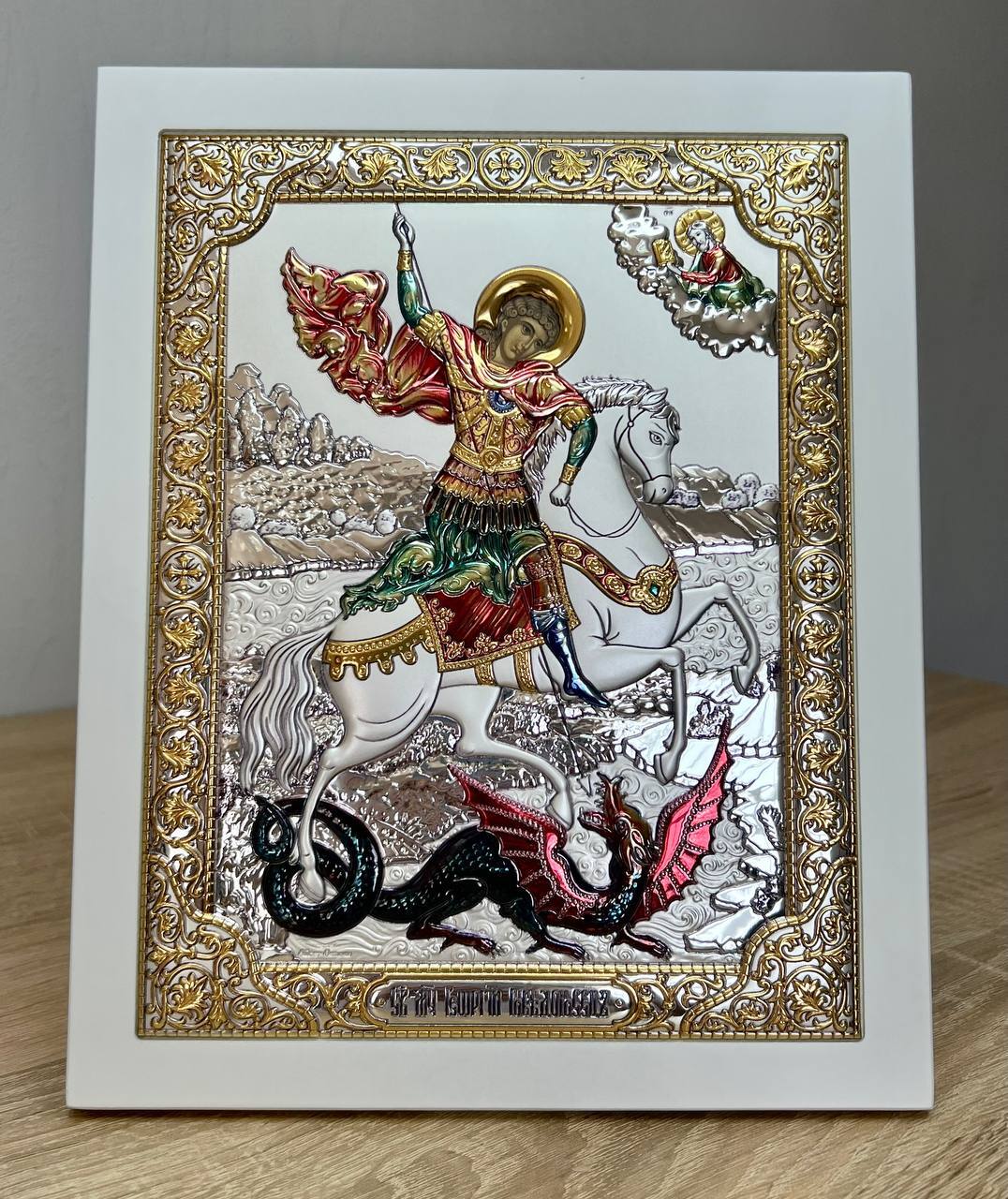 Георгий Победоносец, икона прямоугольная с рамкой, белое дерево, эмаль 150х190мм серебряная Греческая.