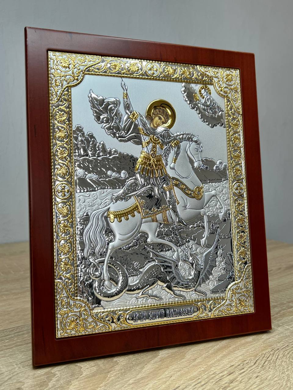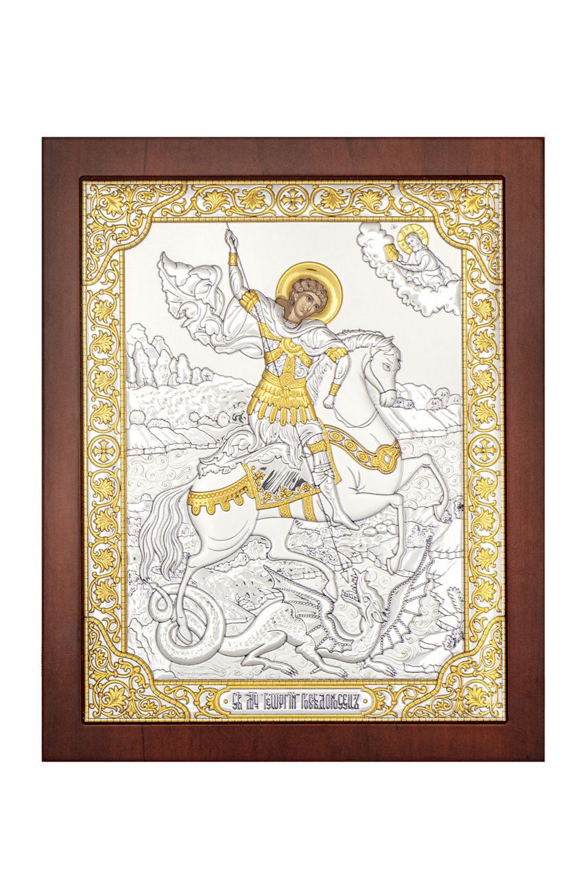 Георгий Победоносец, икона прямоугольная с рамкой, красное дерево 185х235мм серебряная Греческая.