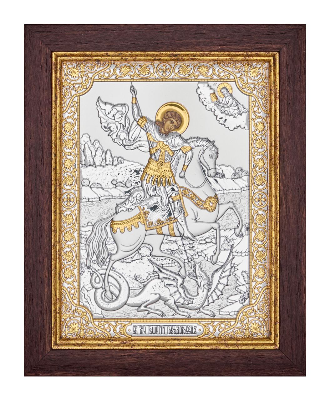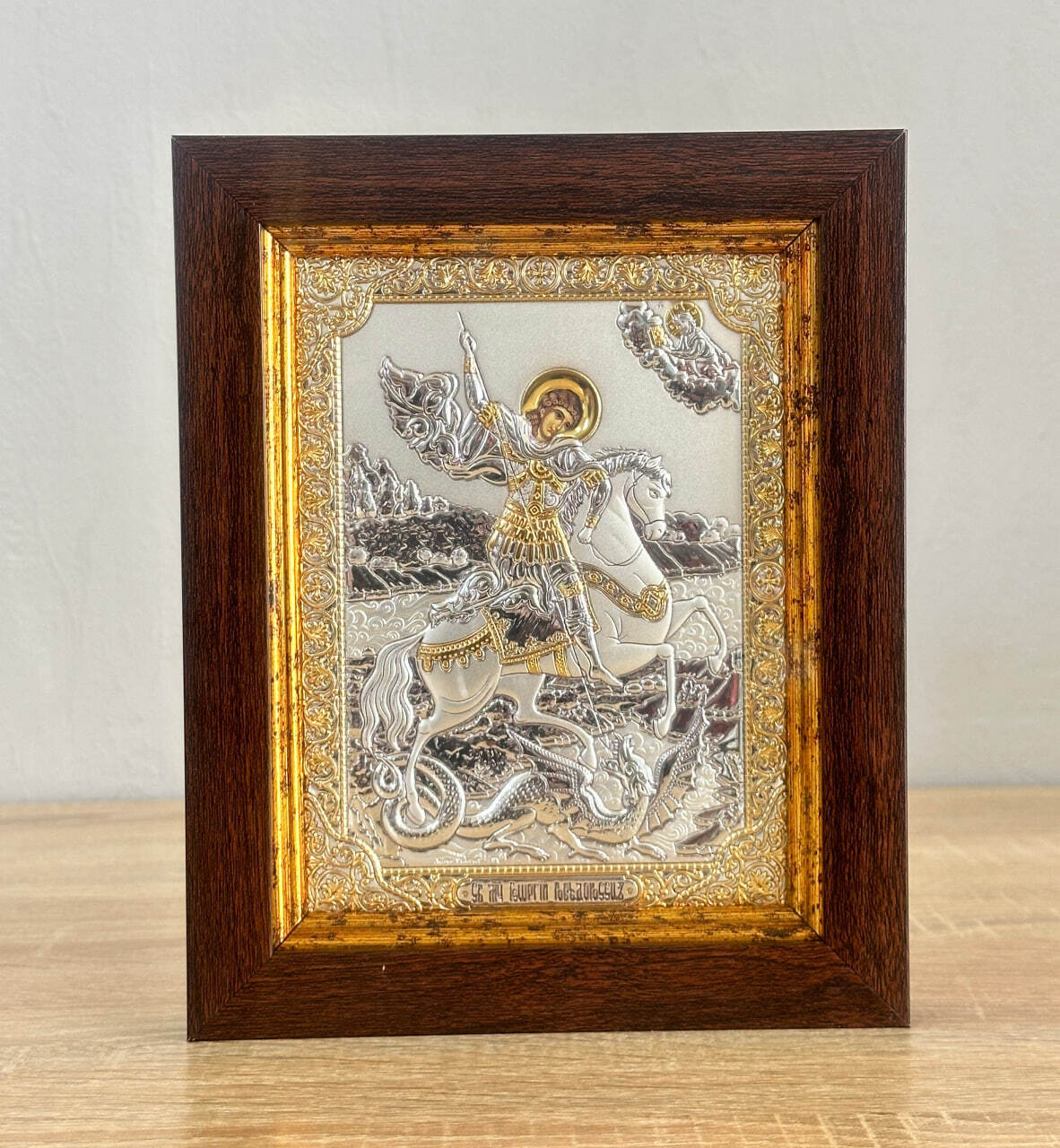 Георгий Победоносец, икона прямоугольная в рамке под стеклом, красное дерево 170х210мм серебряная Греческая.