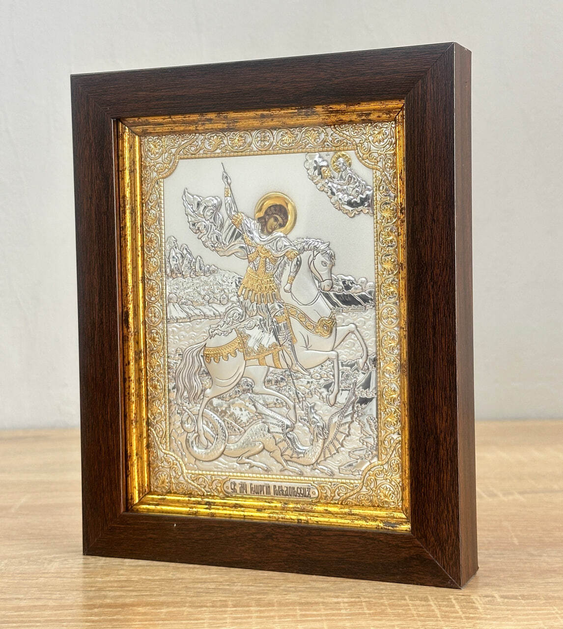 Георгий Победоносец, икона прямоугольная в рамке под стеклом, красное дерево 232х280мм серебряная Греческая.