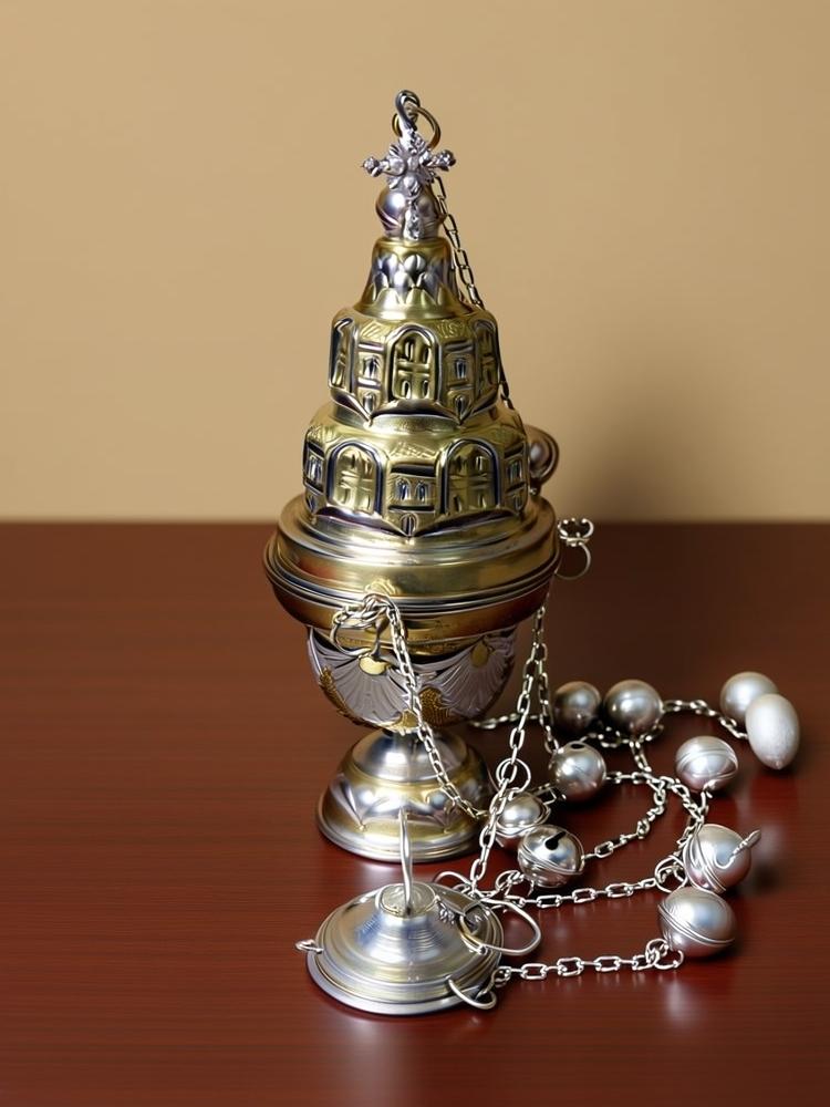Кадило в форме храма, высота: 26 см., Ø: 10 см., латунь, чеканка, никелирование, ручная работа, вес: 590гр.
