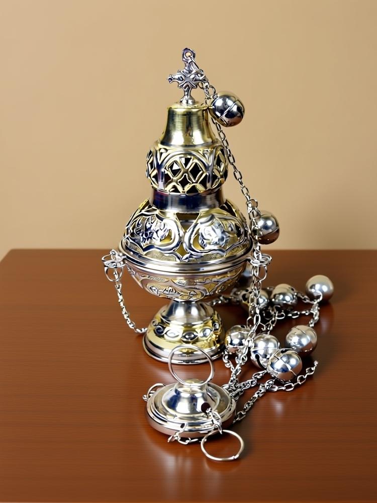 Кадило, латунь, чеканка, никелирование, высота: 23 см., Ø: 10 см., вес: 530гр.