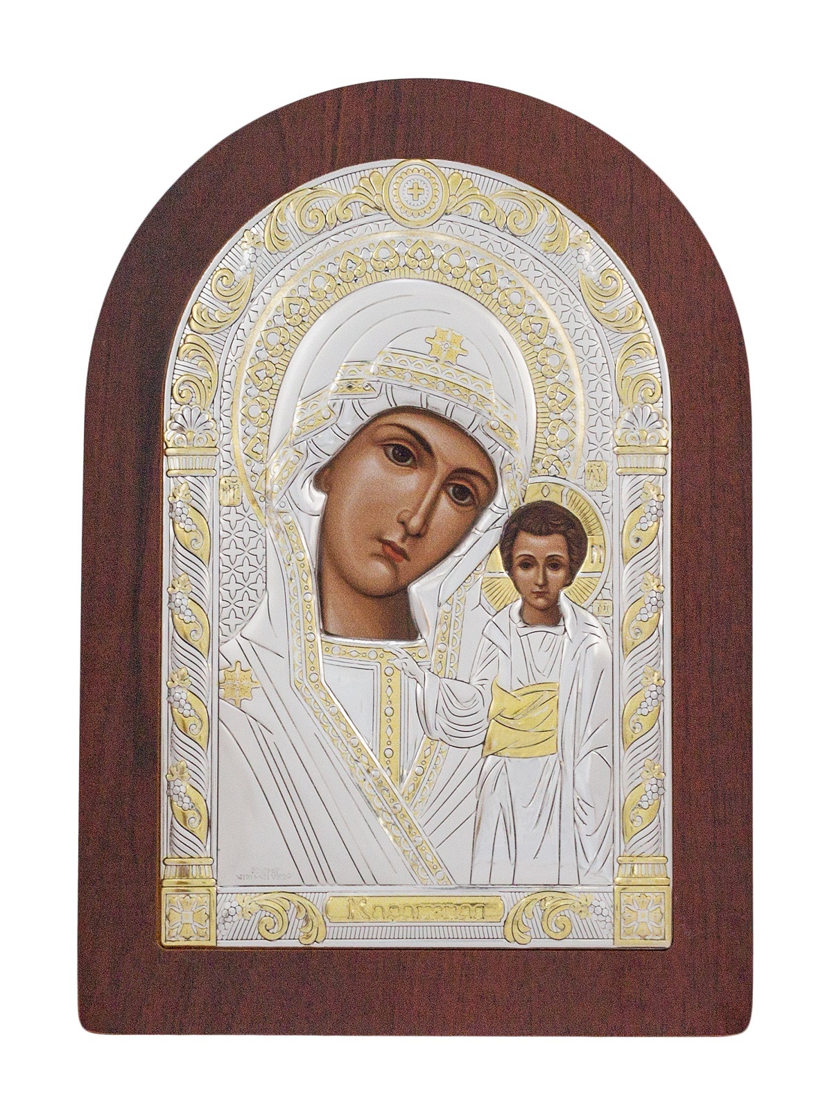Казанская БМ, икона арочная, красное дерево 75х103мм серебряная Греческая.
