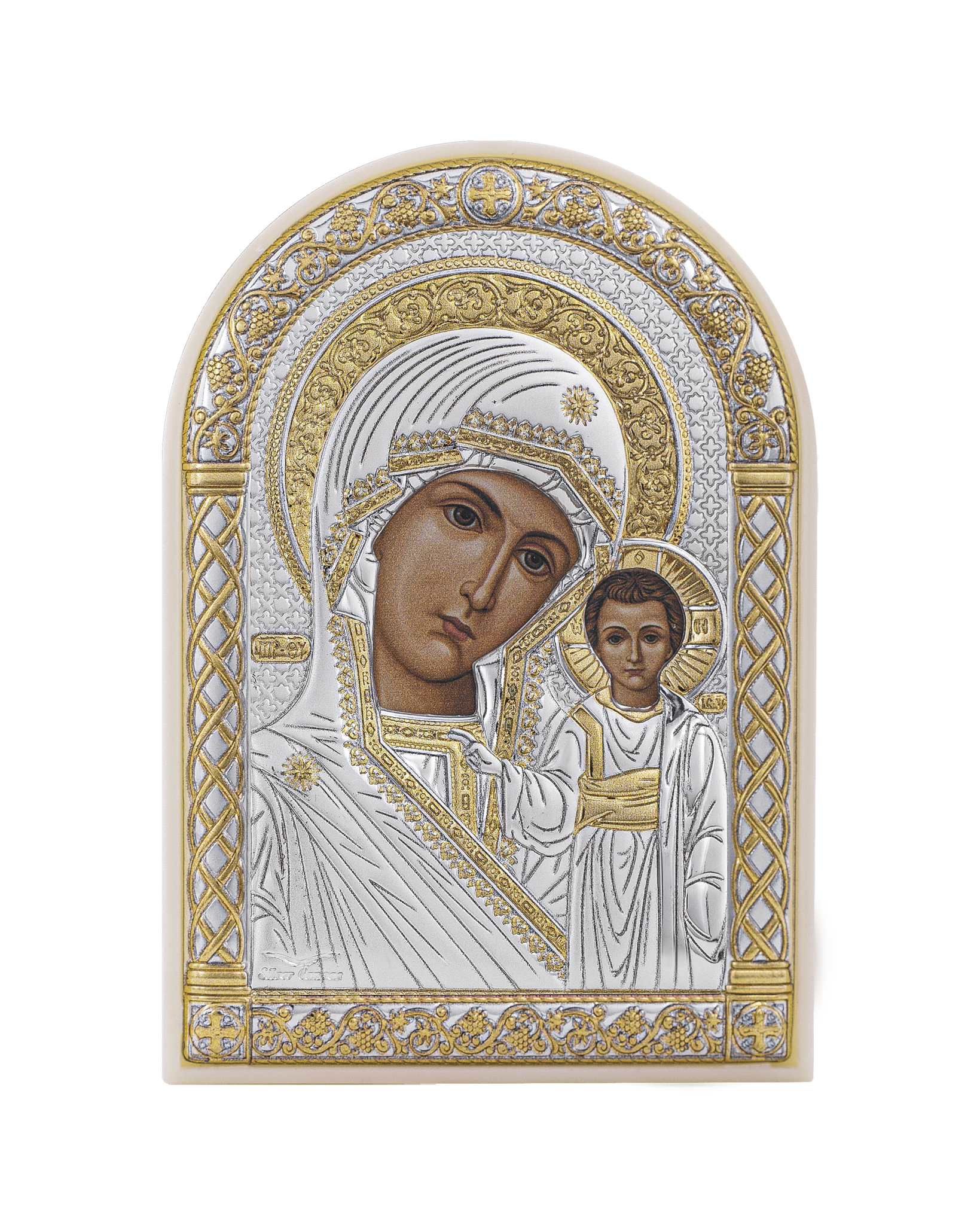 Казанская БМ, икона арочная, пластика белый 80х115мм серебряная Греческая.