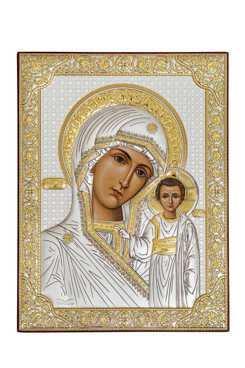 Казанская БМ, икона прямоугольная без рамки, красное дерево 175х225мм серебряная Греческая.