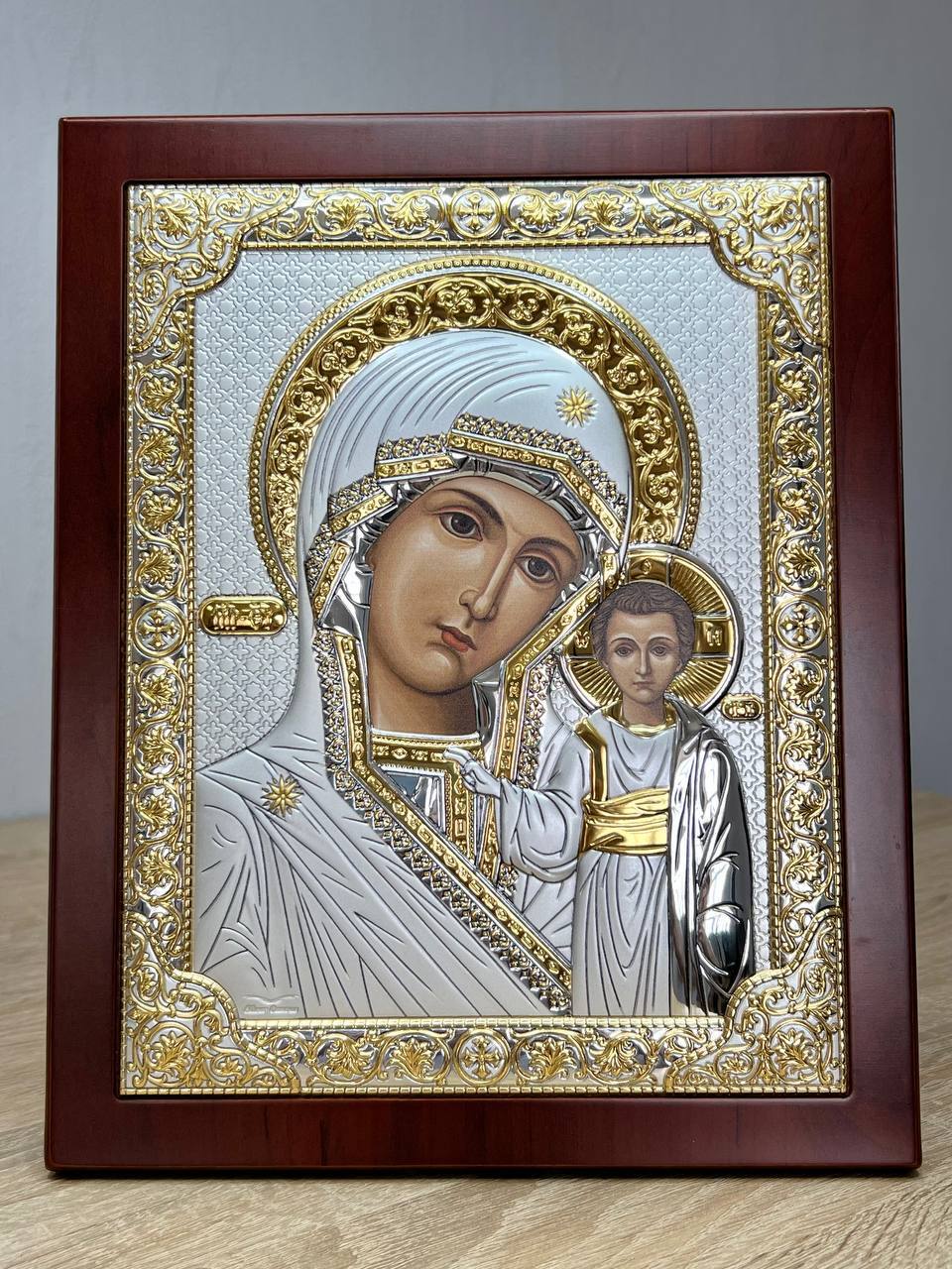 Казанская БМ, икона прямоугольная с рамкой, красное дерево 210х260мм серебряная Греческая.