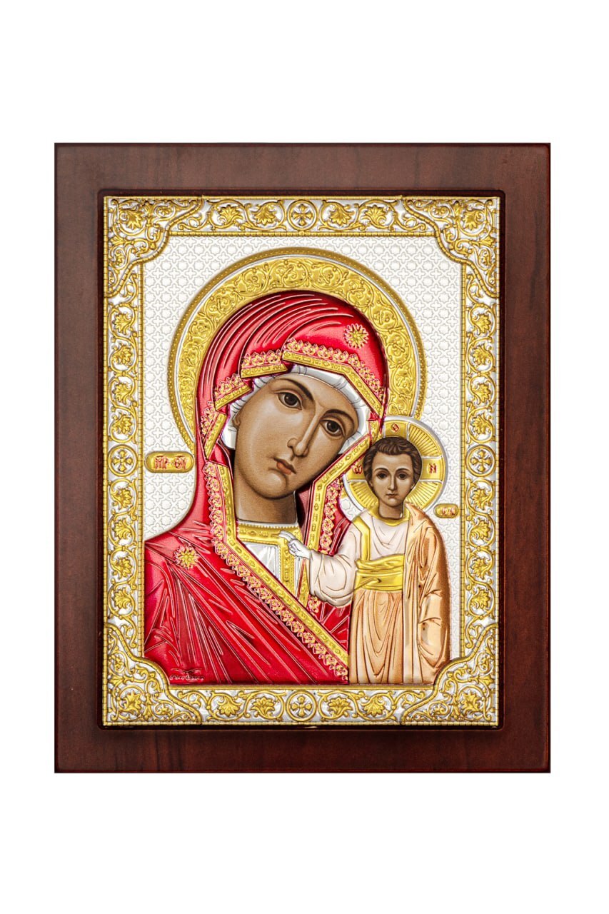 Казанская БМ, икона прямоугольная с рамкой, красное дерево, эмаль 210х260мм серебряная Греческая.