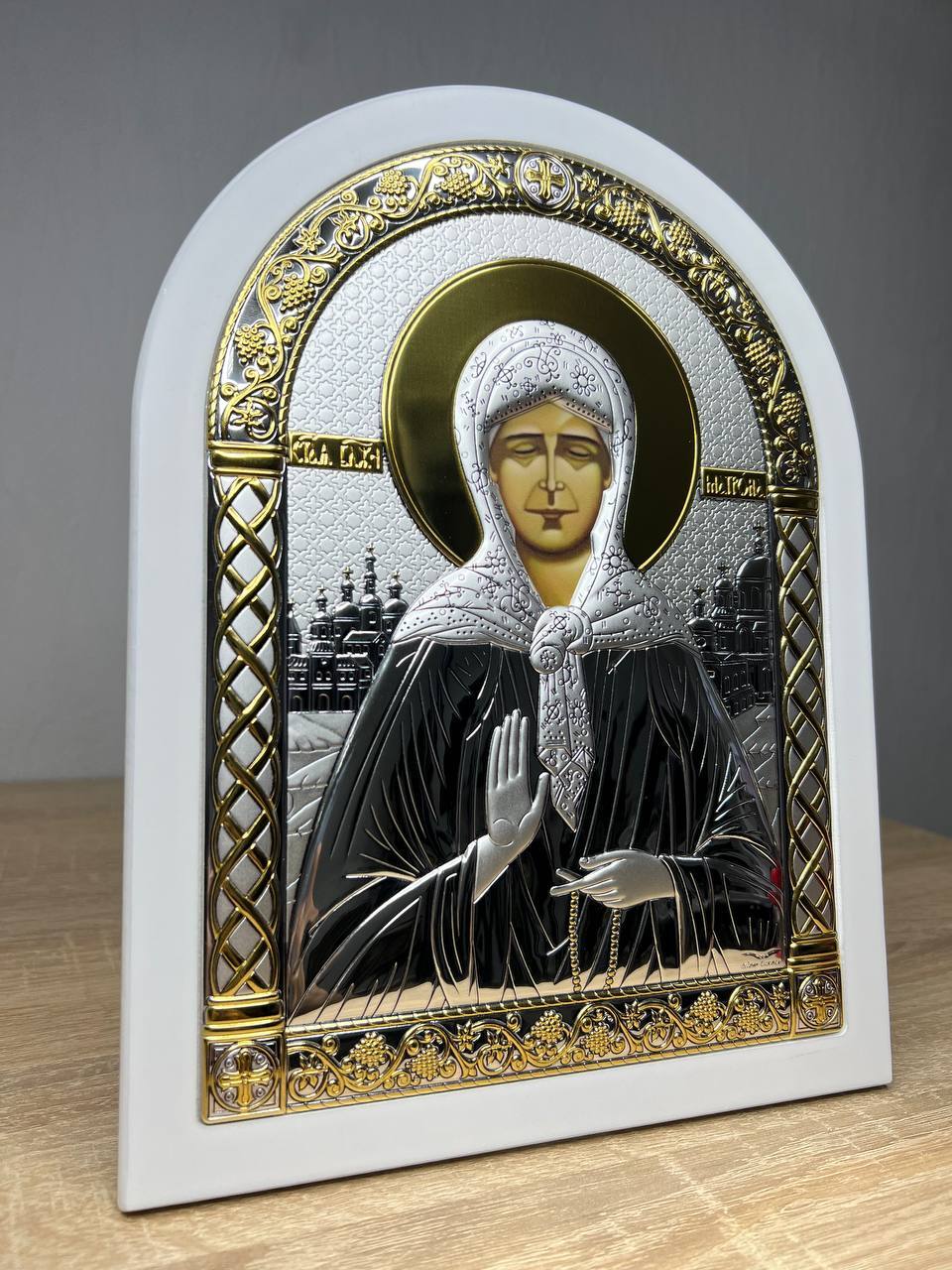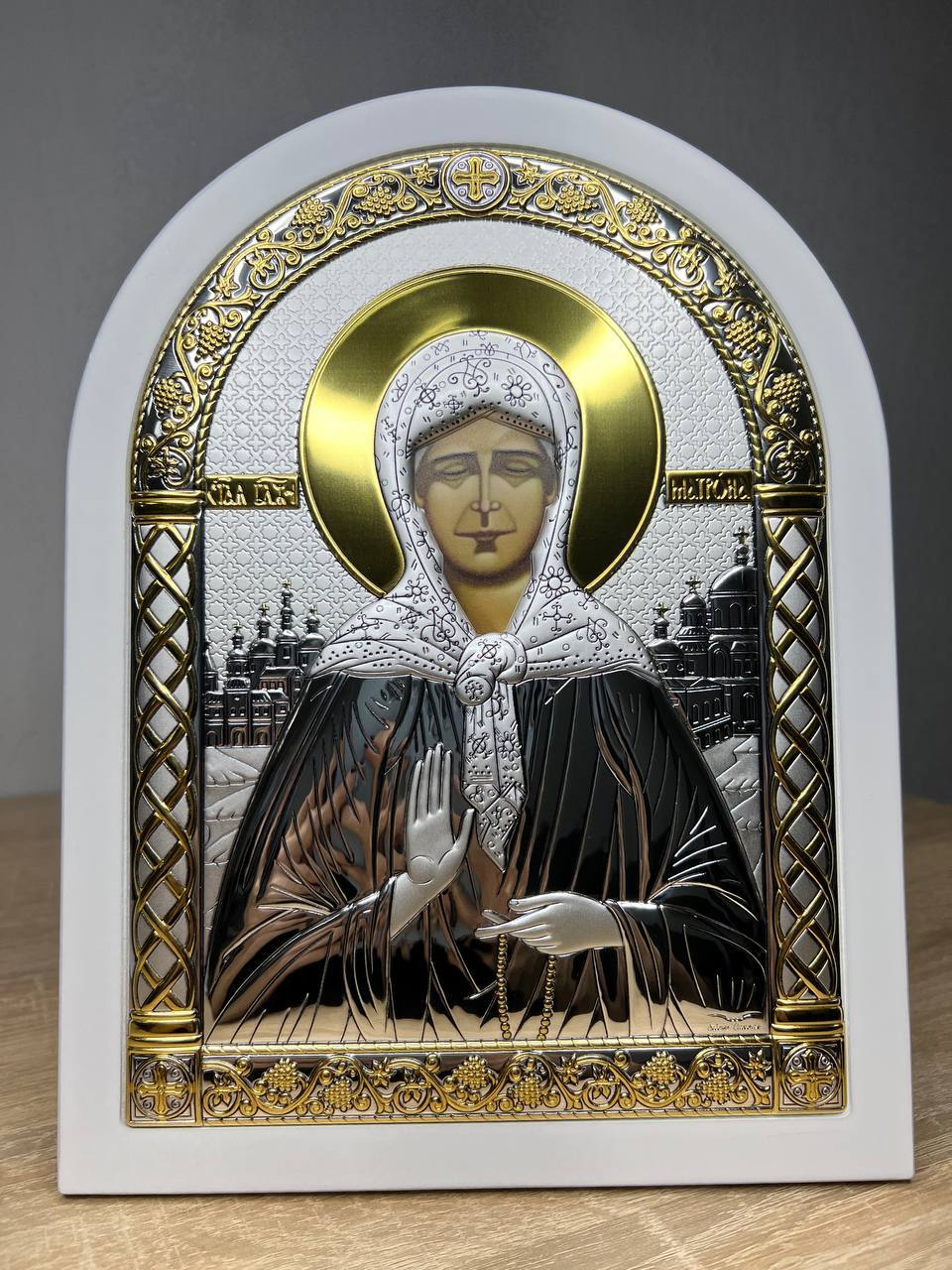 Матрона, икона арочная, белое дерево 206х275мм серебряная Греческая.