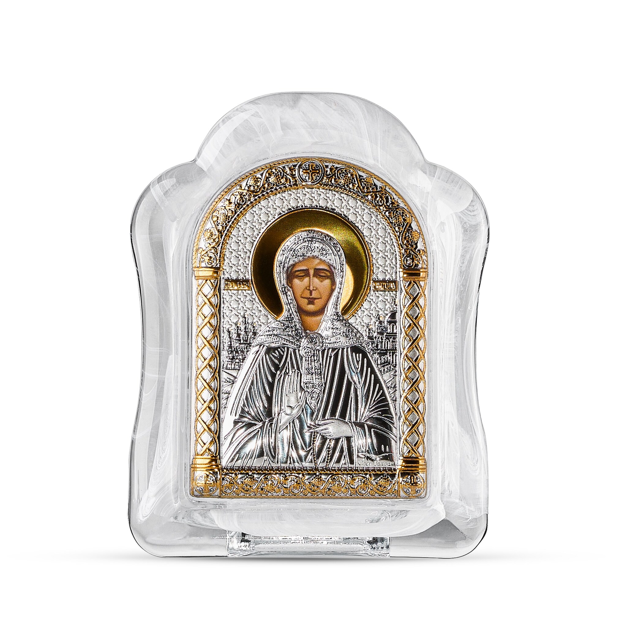 Матрона, икона арочная, белое муранское стекло 103х147мм серебряная Греческая.