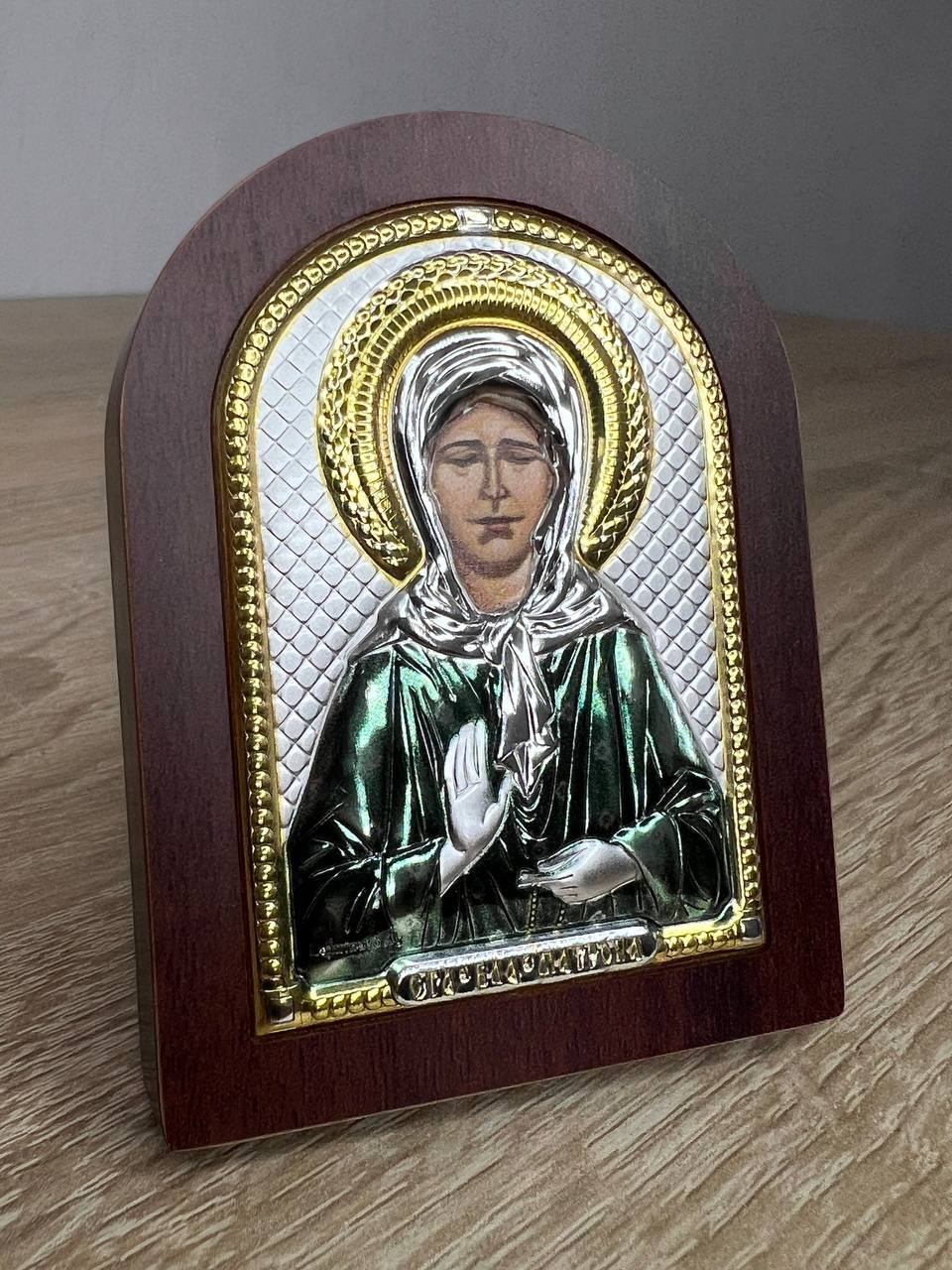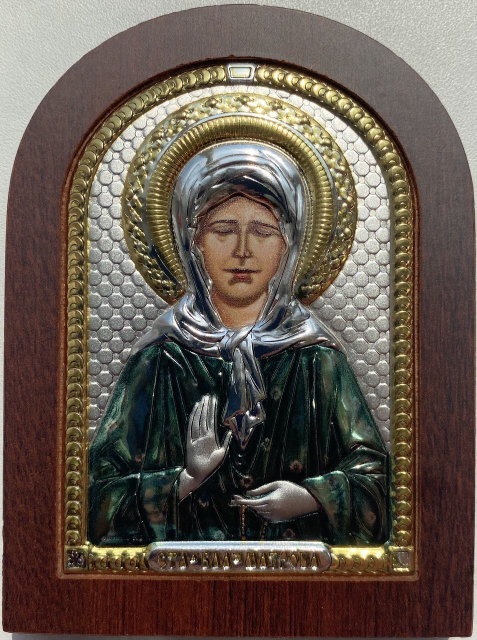 Матрона, икона арочная, красное дерево, эмаль 57х75мм серебряная Греческая.