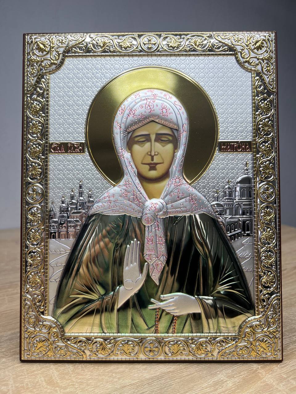Матрона, икона прямоугольная без рамки, красное дерево, эмаль 150х200мм серебряная Греческая.