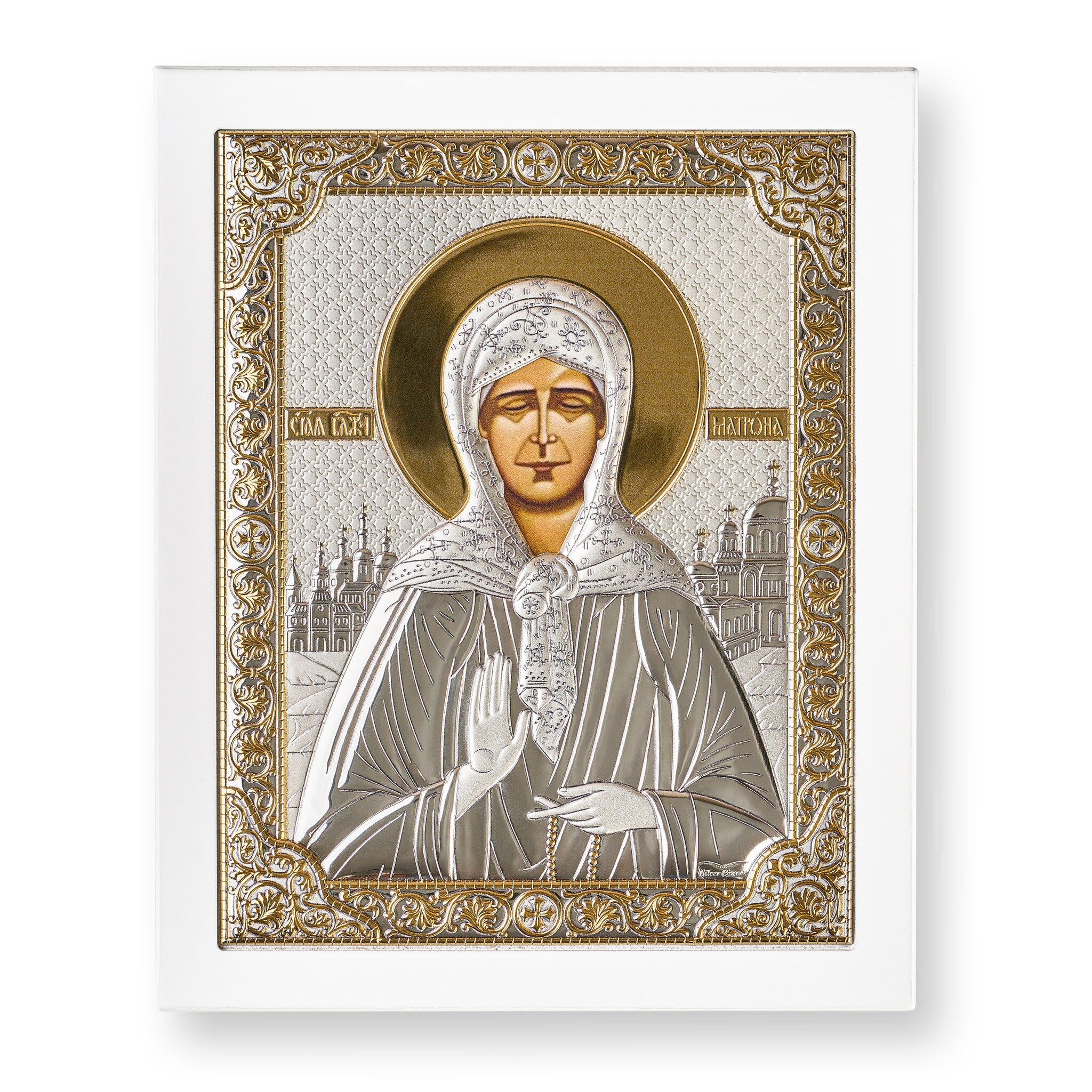 Матрона, икона прямоугольная с рамкой, белое дерево 210х260мм серебряная Греческая.