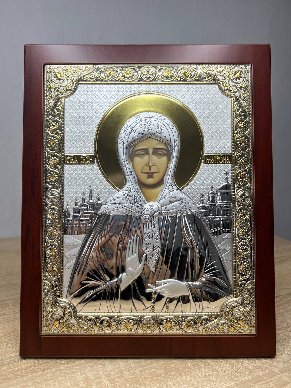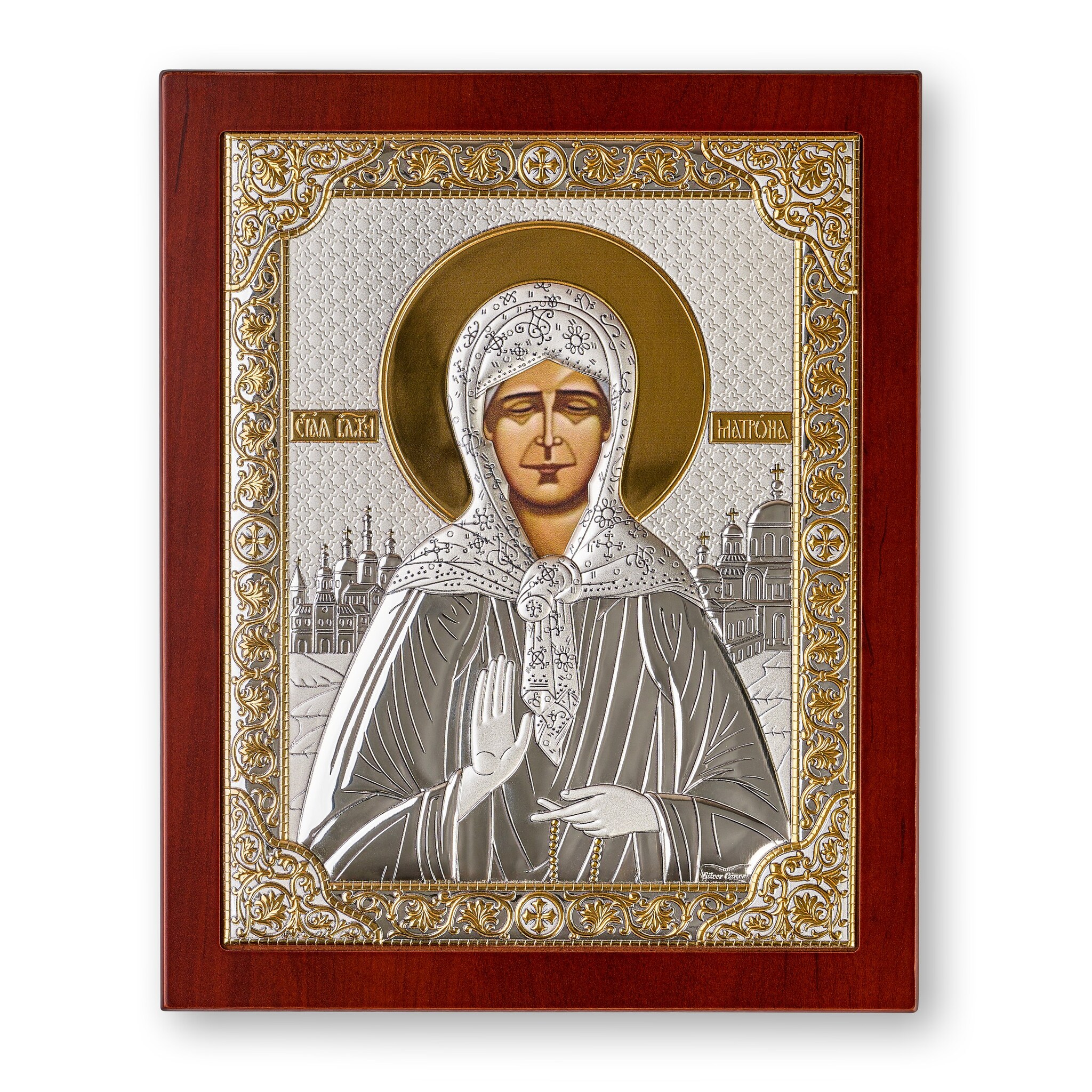 Матрона, икона прямоугольная с рамкой, красное дерево 185х235мм серебряная Греческая.