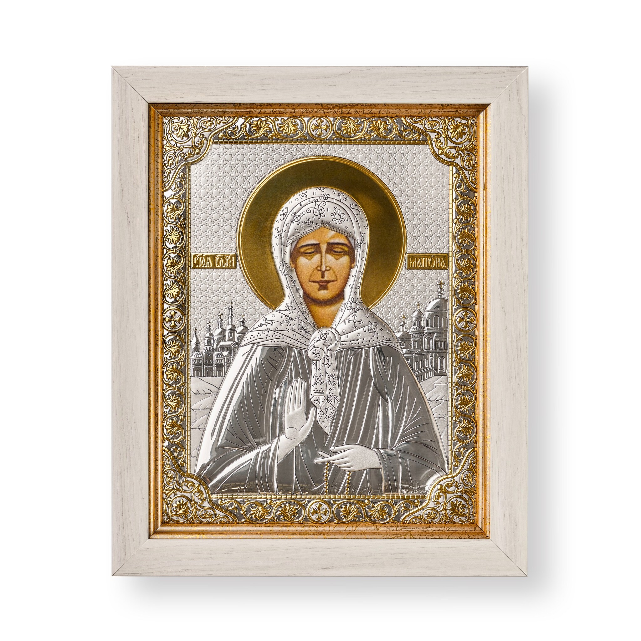 Матрона, икона прямоугольная в рамке под стеклом, белое дерево 232х280мм серебряная Греческая.