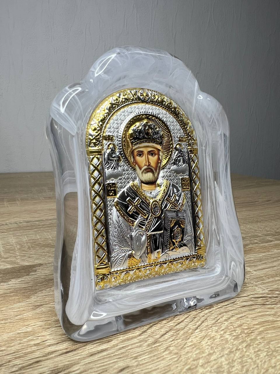 Николай Чудотворец, икона арочная, белое муранское стекло 86х112мм серебряная Греческая.
