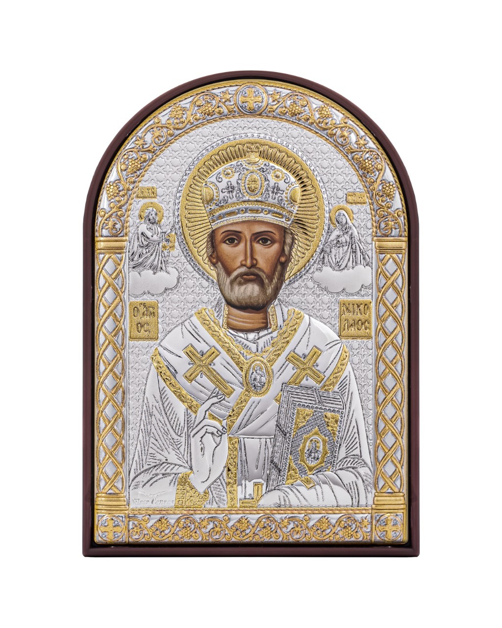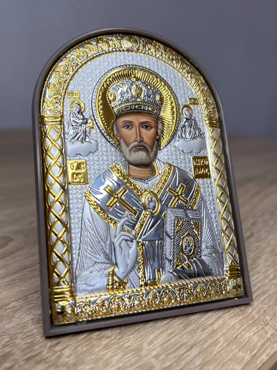 Николай Чудотворец, икона арочная, пластик коричневый 80х115 серебряная Греческая.