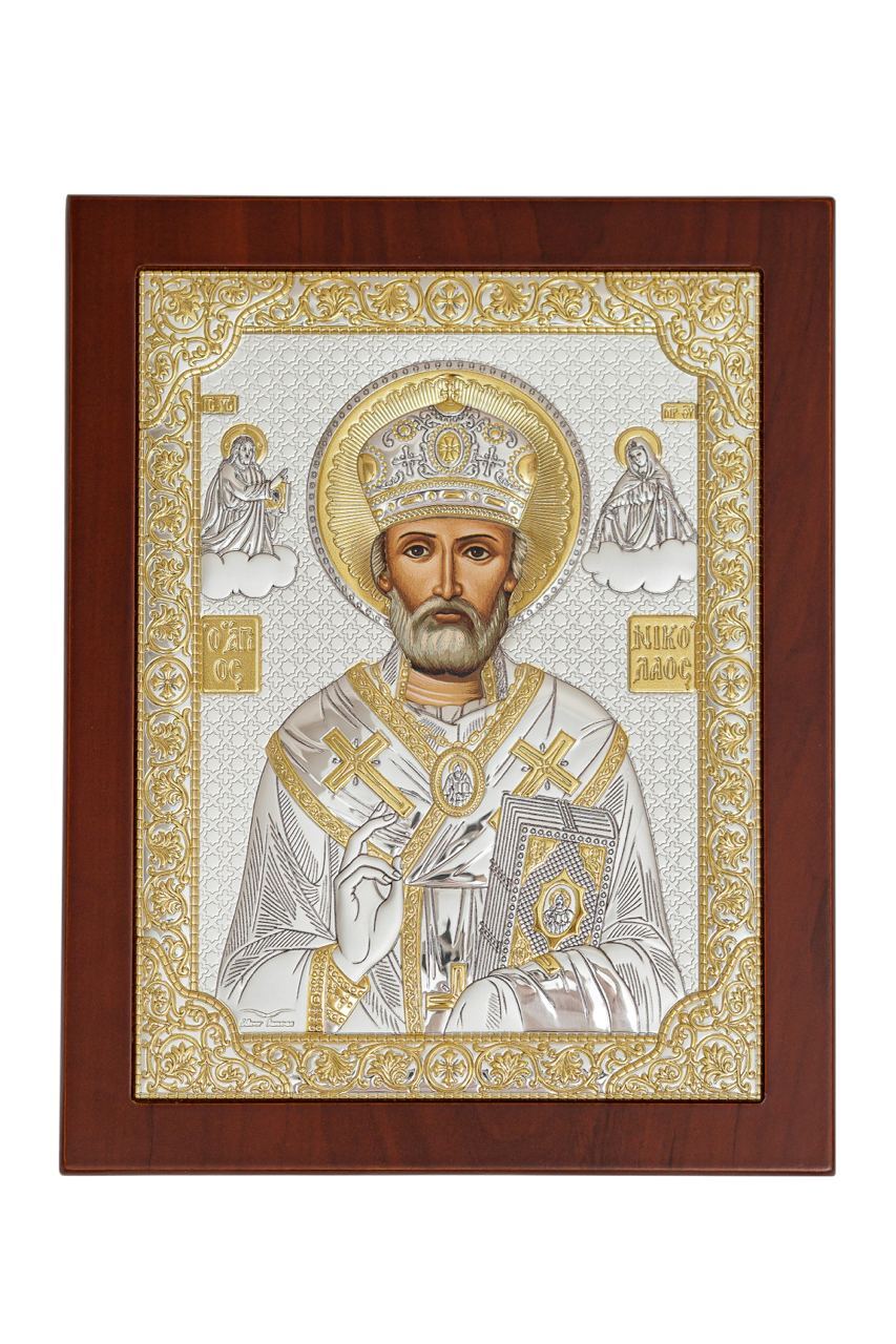 Николай Чудотворец, икона прямоугольная с рамкой, красное дерево 210х260мм серебряная Греческая.