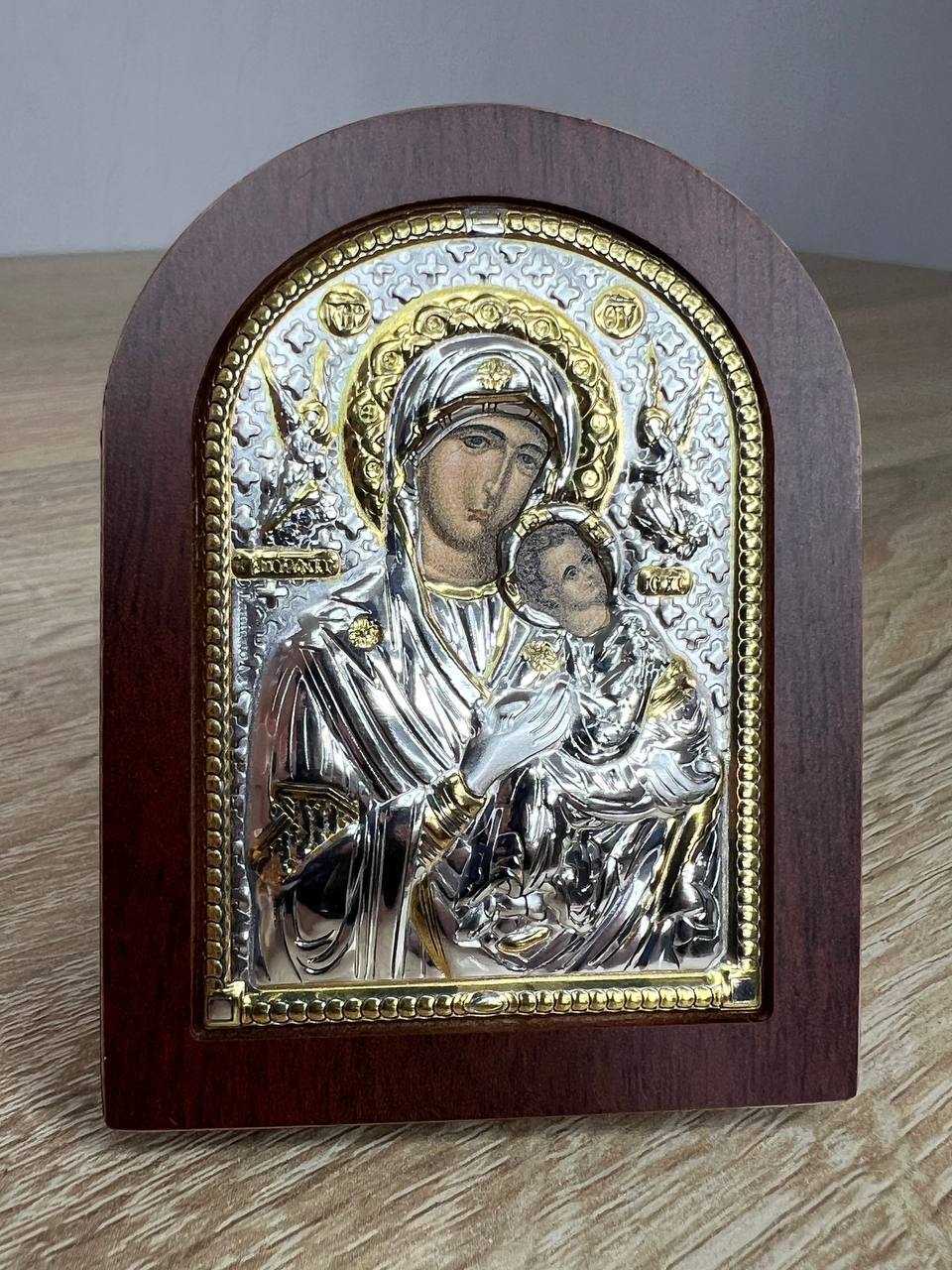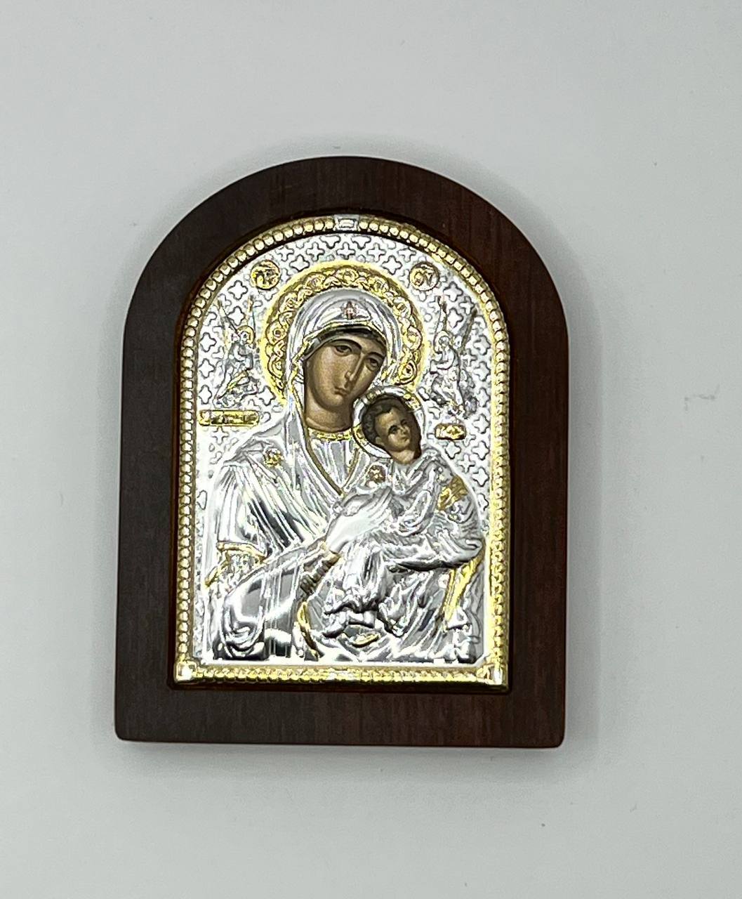 Страстная БМ, икона арочная, красное дерево 57х75мм серебряная Греческая.