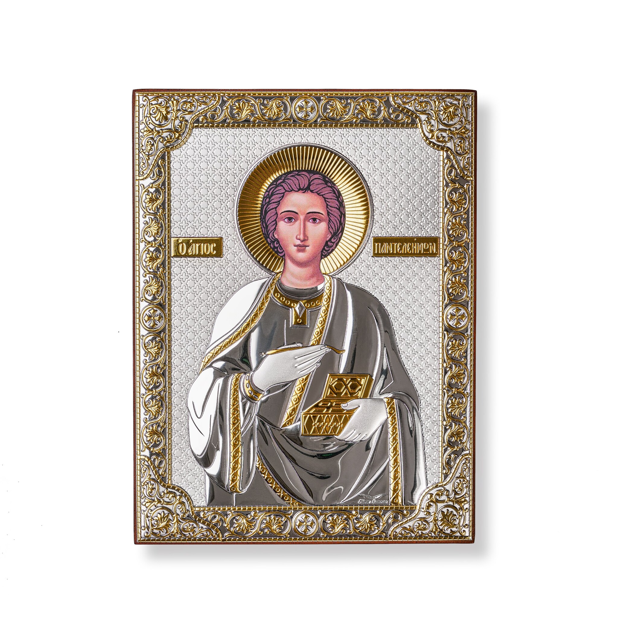 Пантелеймон, икона прямоугольная без рамки, красное дерево 120х160мм серебряная Греческая.