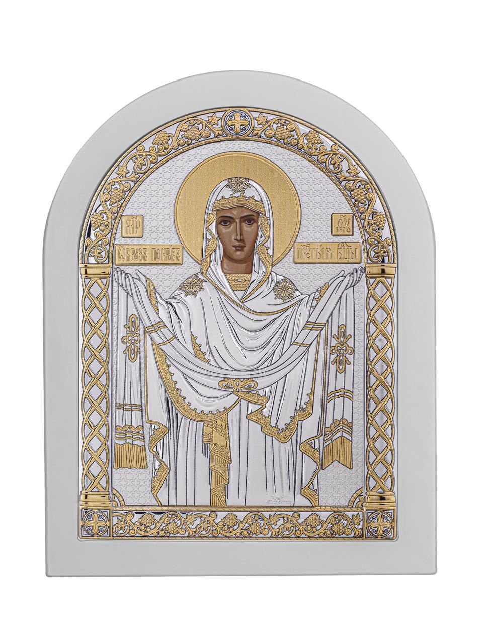 Покрова БМ, икона арочная, белое дерево 175х225мм серебряная Греческая.