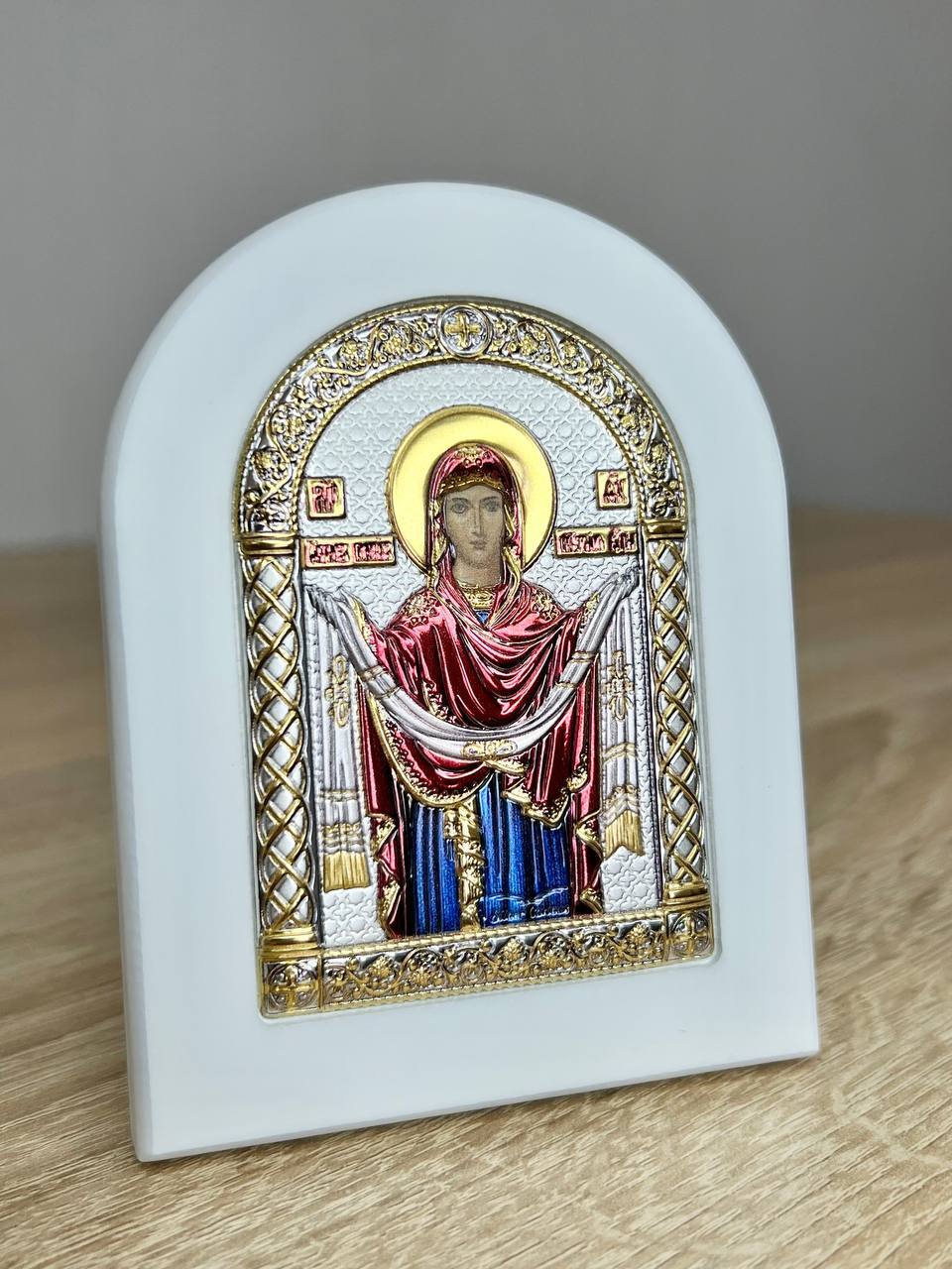 Покрова БМ, икона арочная, белое дерево, эмаль 86х112мм серебряная Греческая.