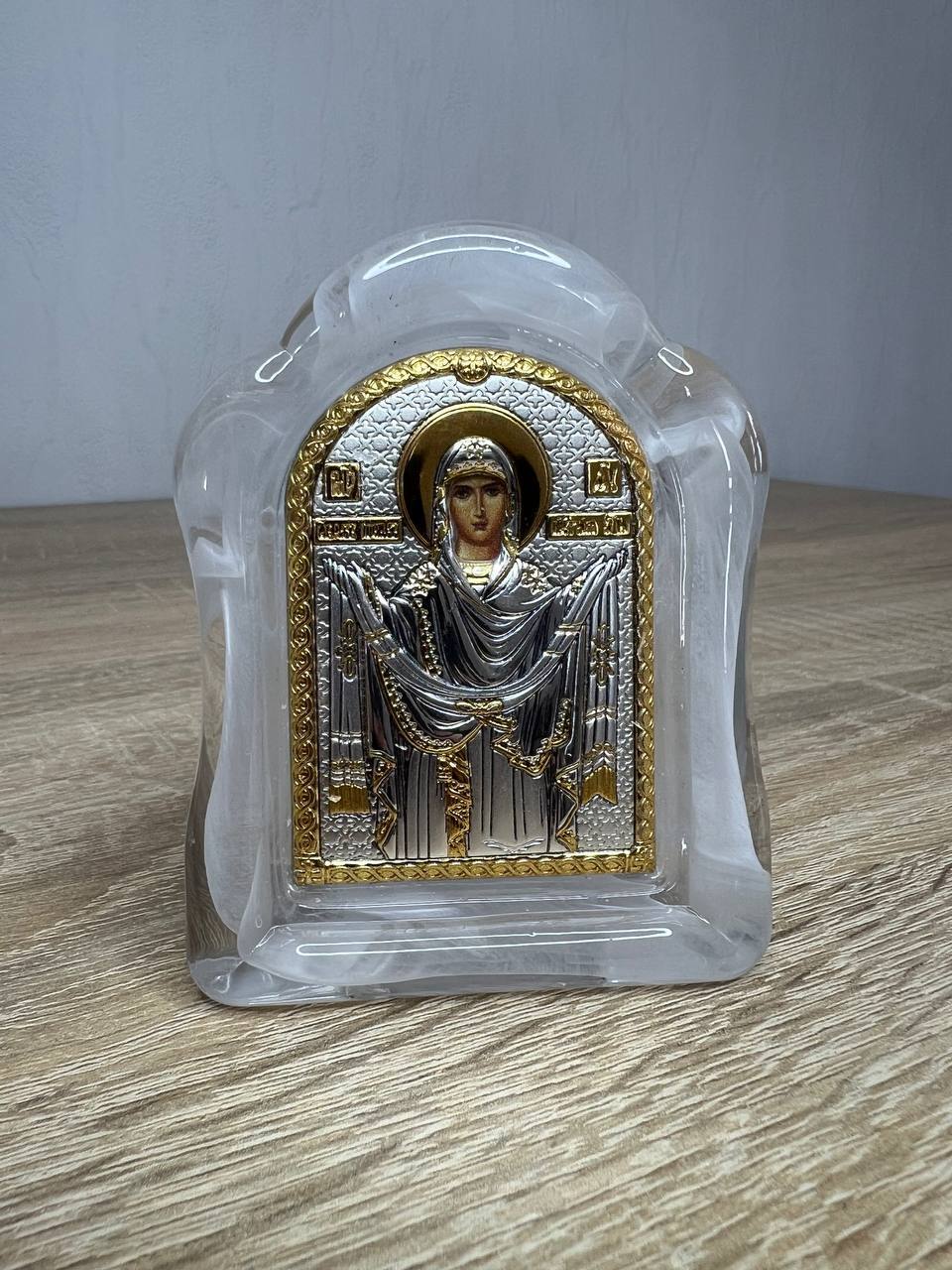 Покрова БМ, икона арочная, белое муранское стекло 65х85мм серебряная Греческая.