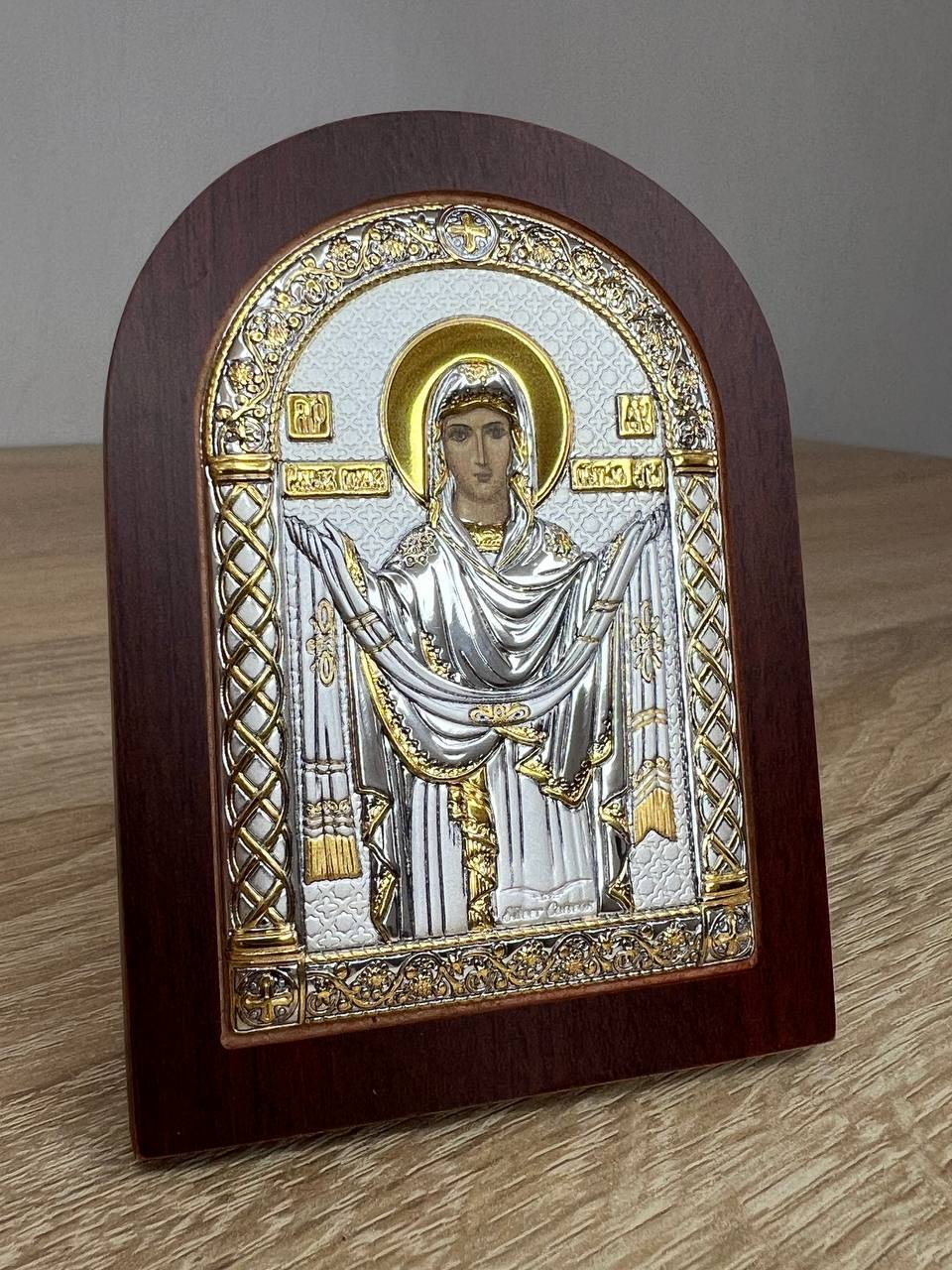 Покрова БМ, икона арочная, красное дерево, 86х112мм серебряная Греческая.