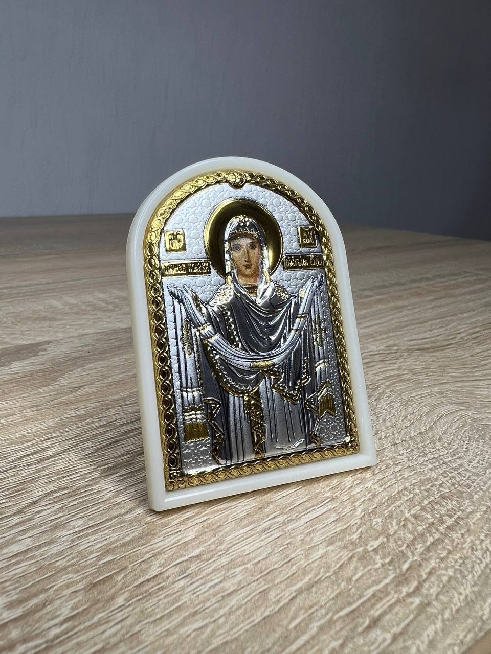 Покрова БМ, икона арочная, пластик белый 48x68мм. серебряная Греческая