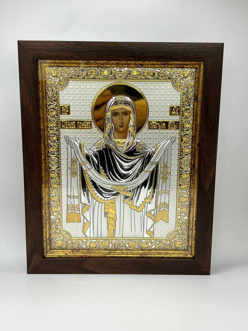 Покрова БМ, икона прямоугольная в рамке под стеклом, красное дерево, 232х280 серебряная Греческая.