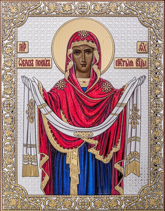 Покрова, икона прямоугольная без рамки, красное дерево, эмаль 120х160мм серебряная Греческая.
