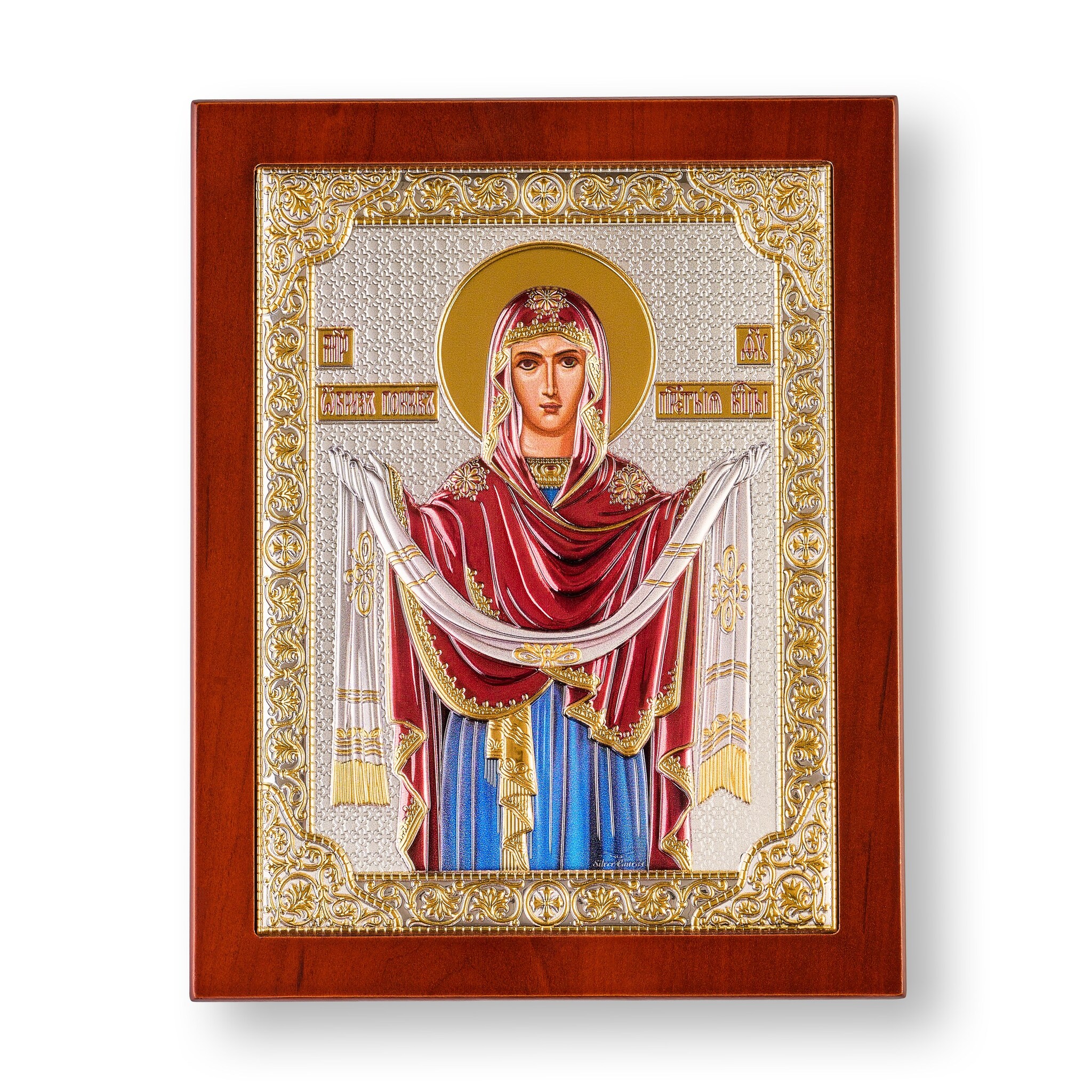 Покрова, икона прямоугольная с рамкой, красное дерево, эмаль 185х235мм серебряная Греческая.