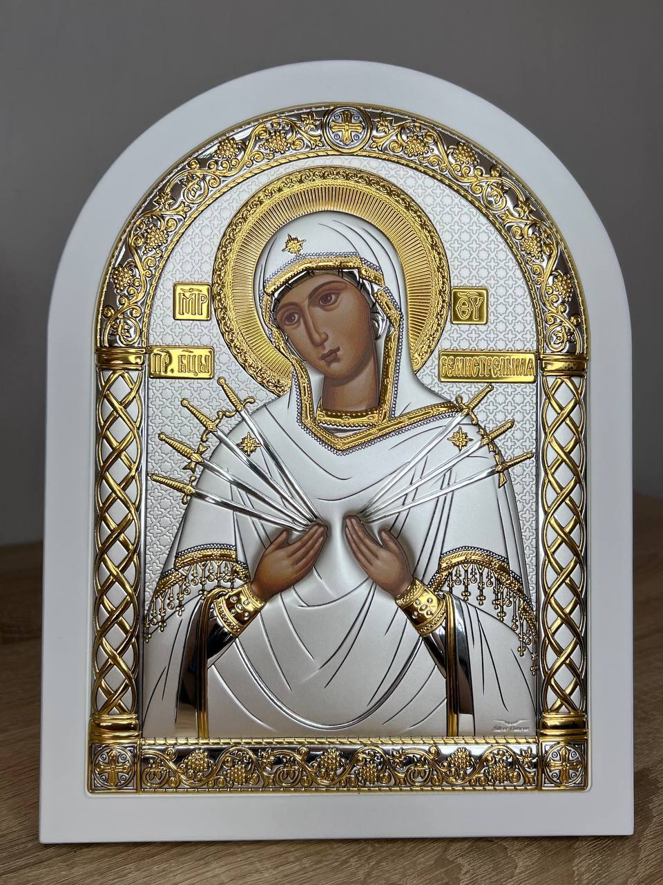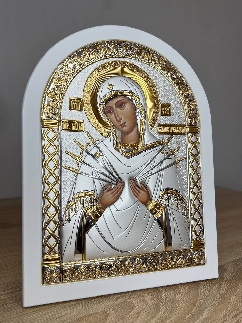 Семистрельная БМ, икона арочная, белое дерево 175х225мм серебряная Греческая.