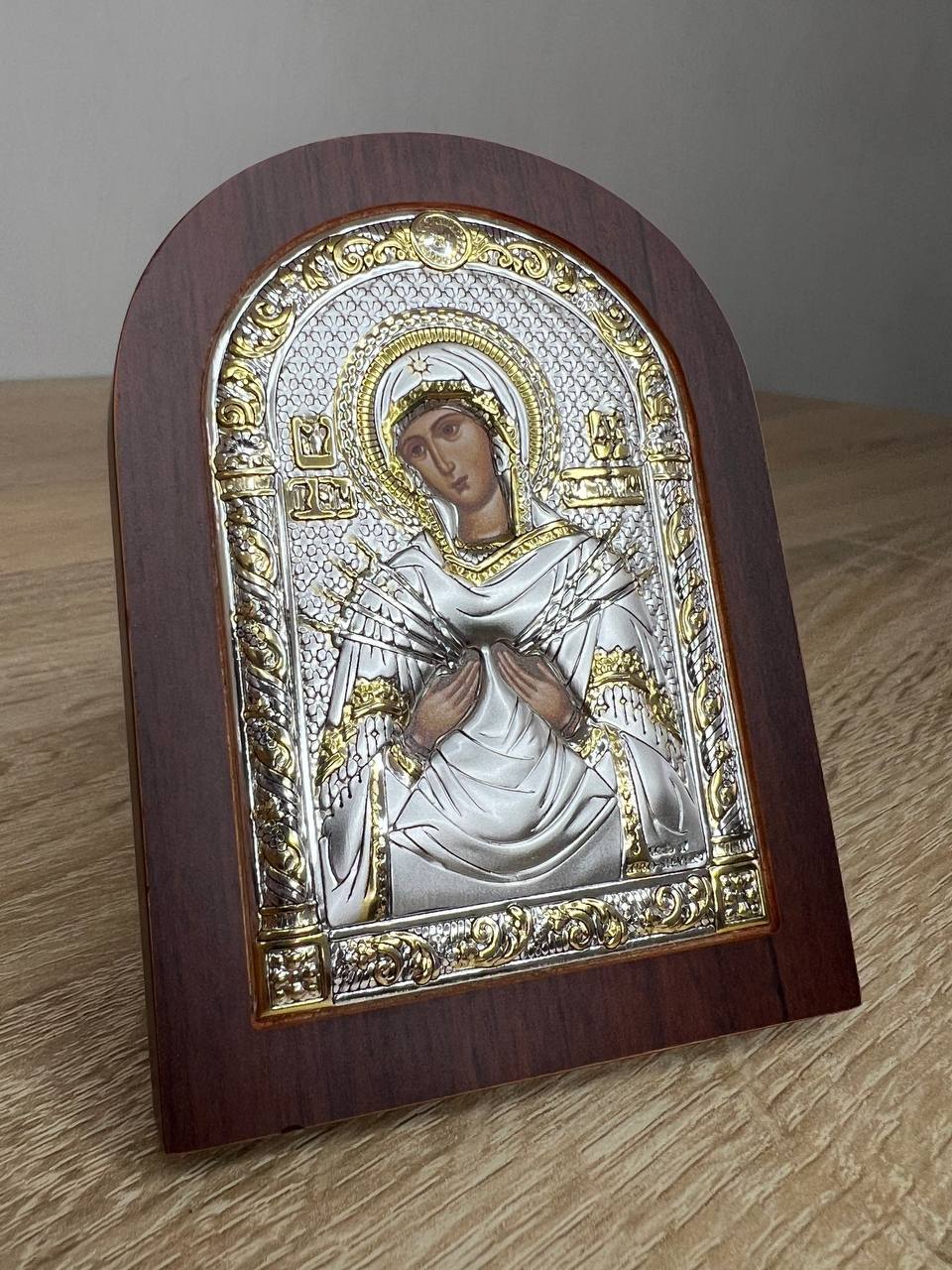 Семистрельная БМ, икона арочная, красное дерево, 60х75мм серебряная Греческая.