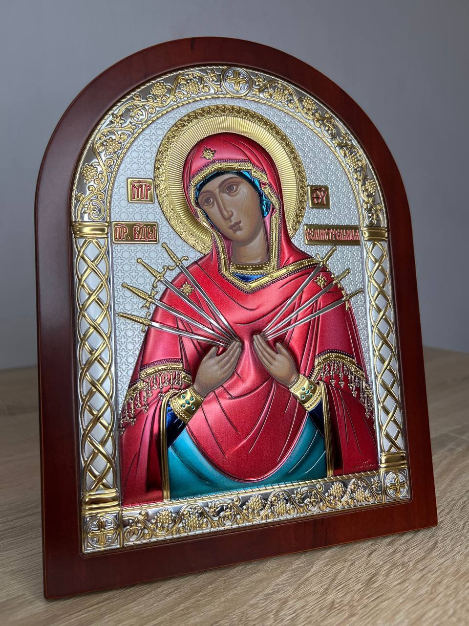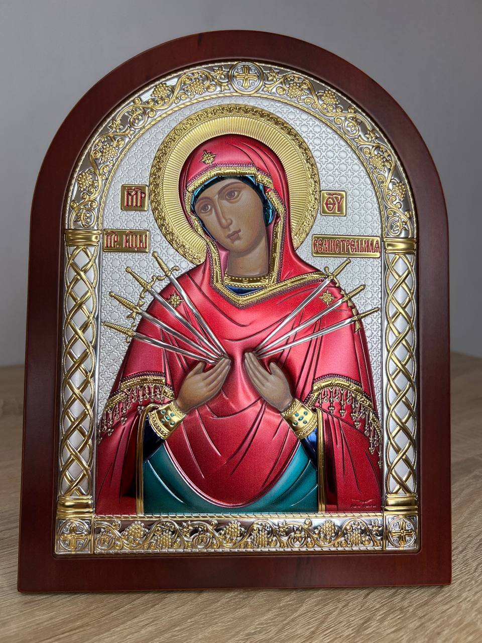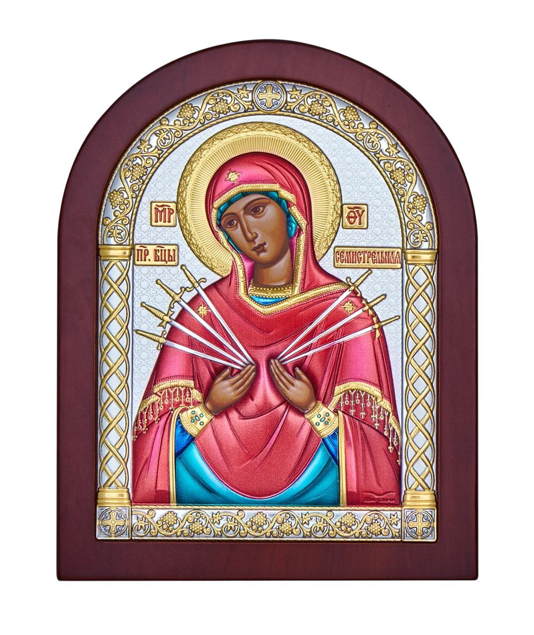 Семистрельная БМ, икона арочная, красное дерево, эмаль 175х225мм серебряная Греческая.