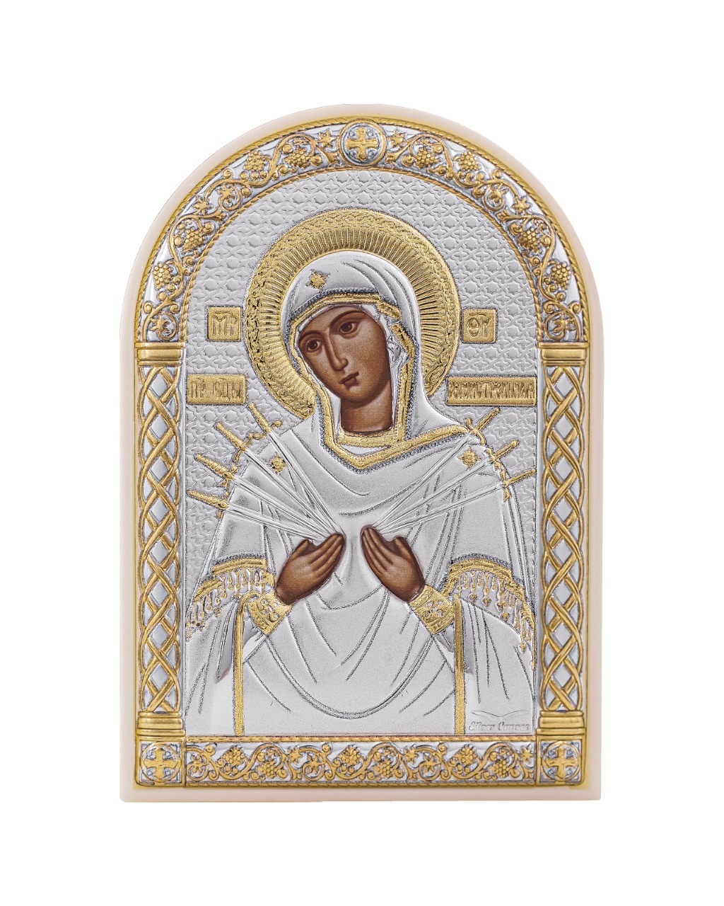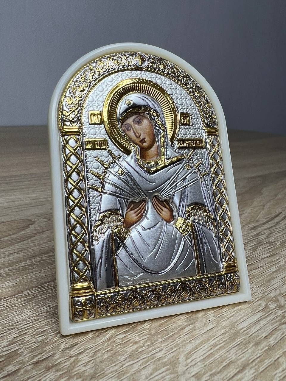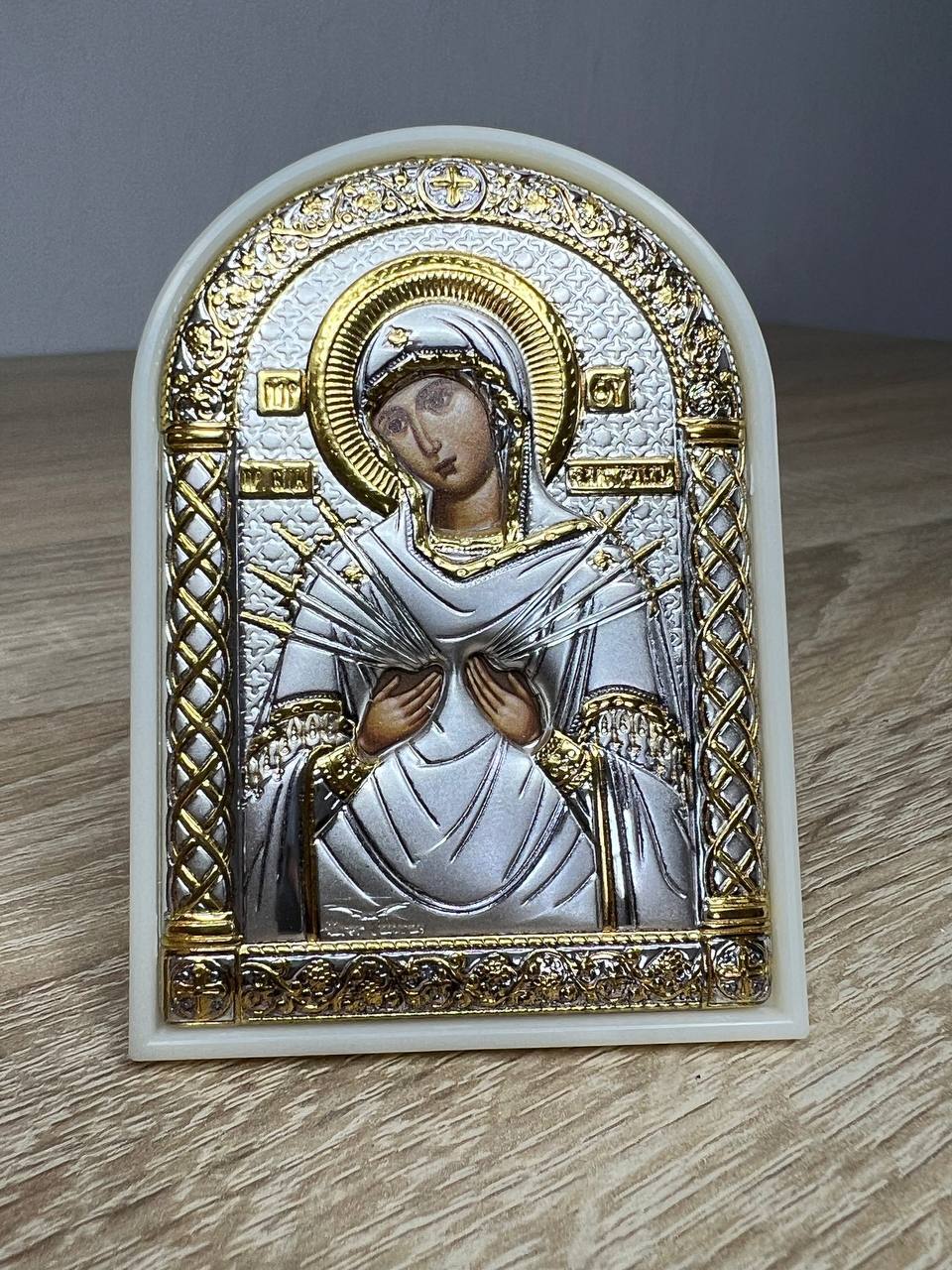 Семистрельная БМ, икона арочная, пластик белый 80х115мм серебряная Греческая.