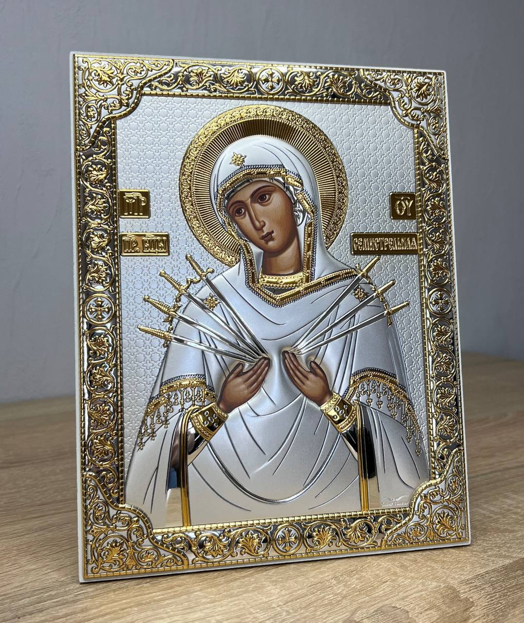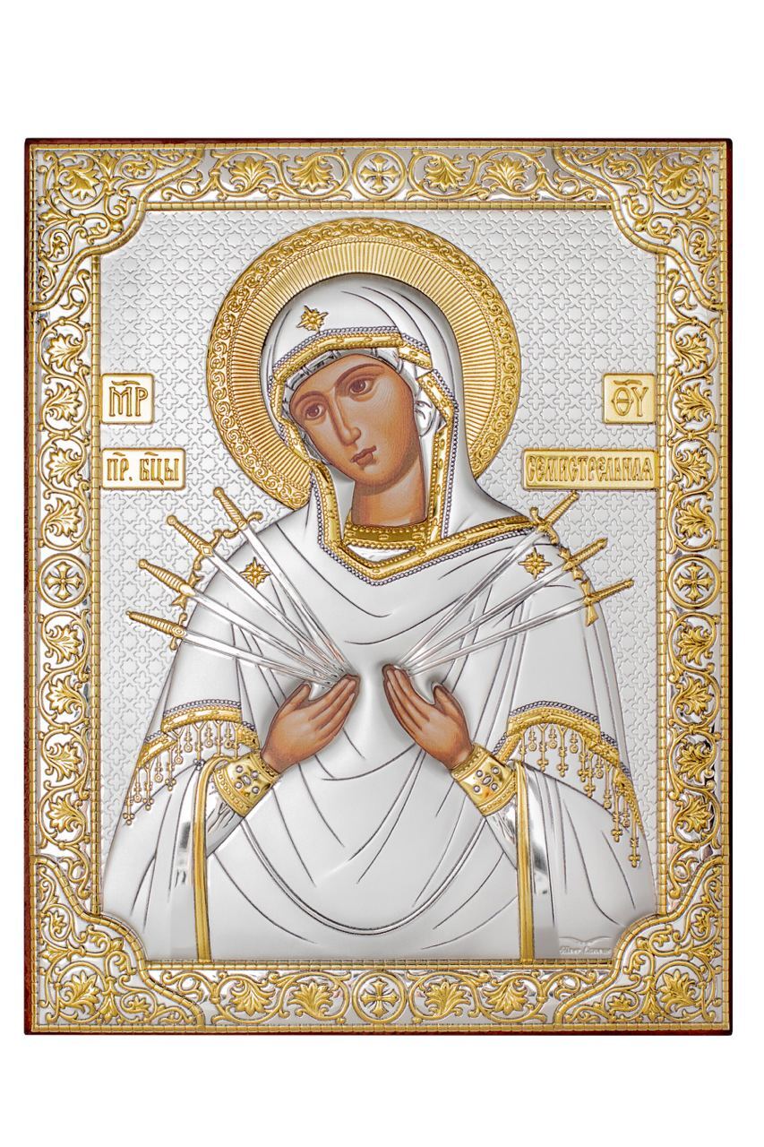 Семистрельная БМ, икона прямоугольная без рамки, белое дерево 175х225мм серебряная Греческая.