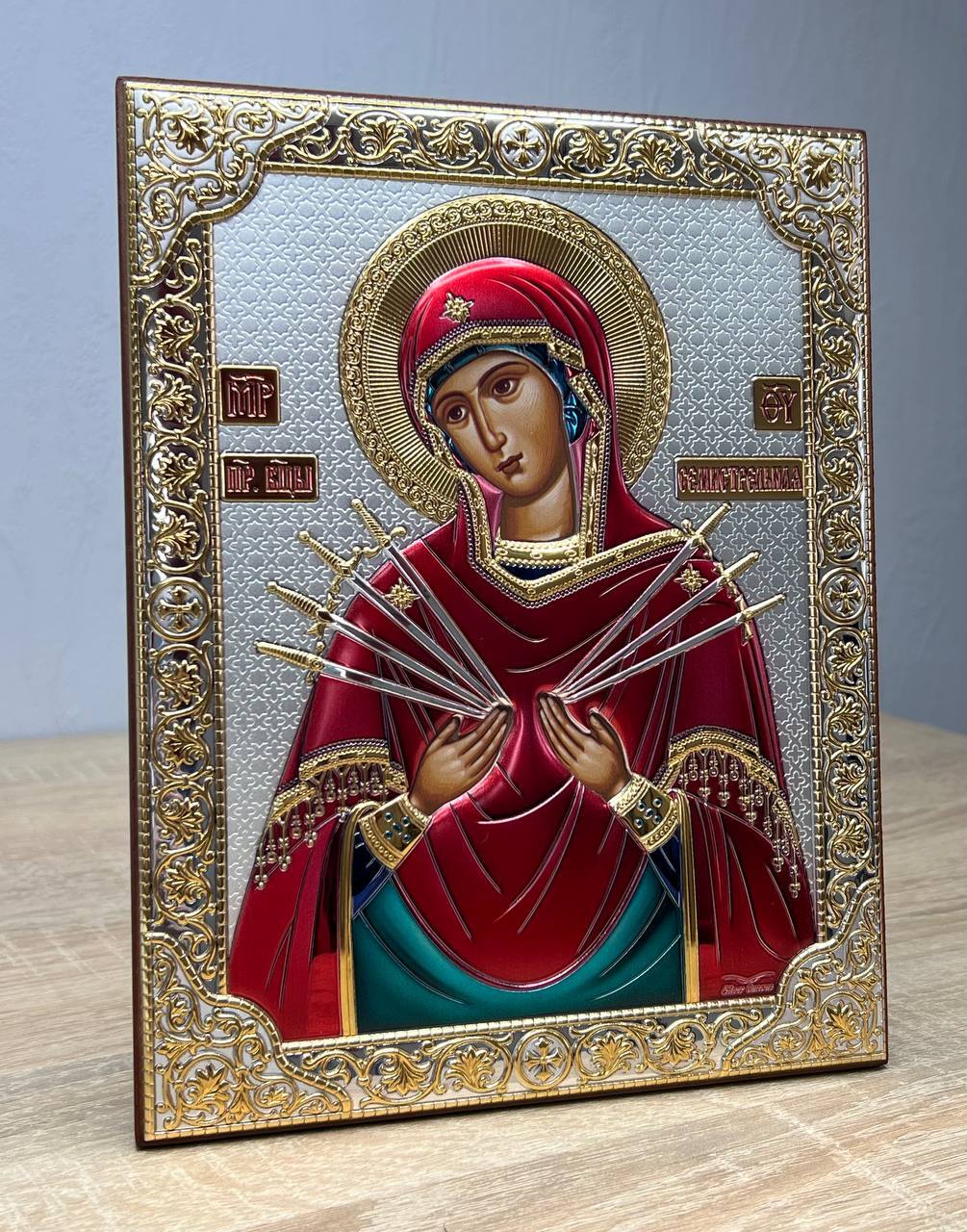 Семистрельная БМ, икона прямоугольная без рамки, красное дерево, эмаль 150х200мм серебряная Греческая.