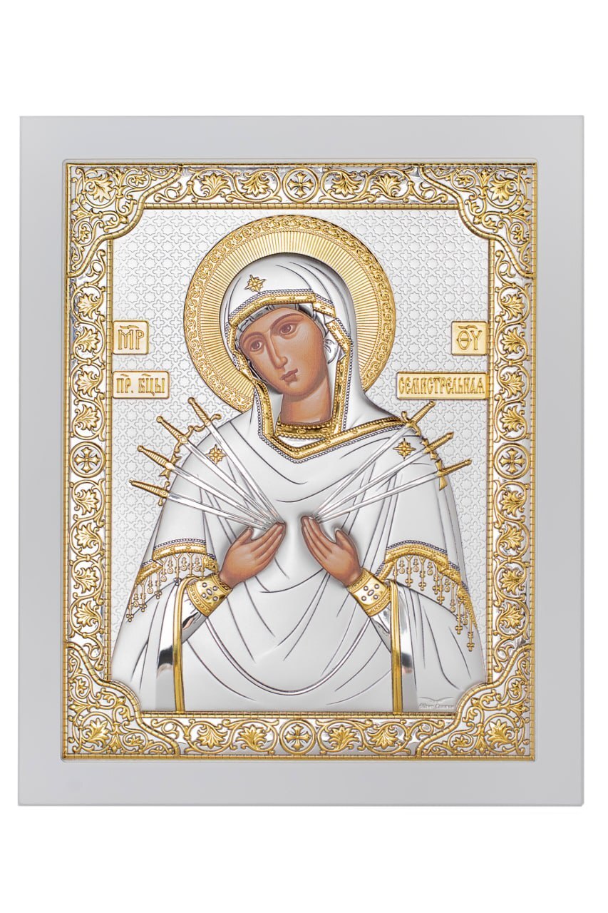 Семистрельная БМ, икона прямоугольная с рамкой, белое дерево 210х260мм серебряная Греческая.
