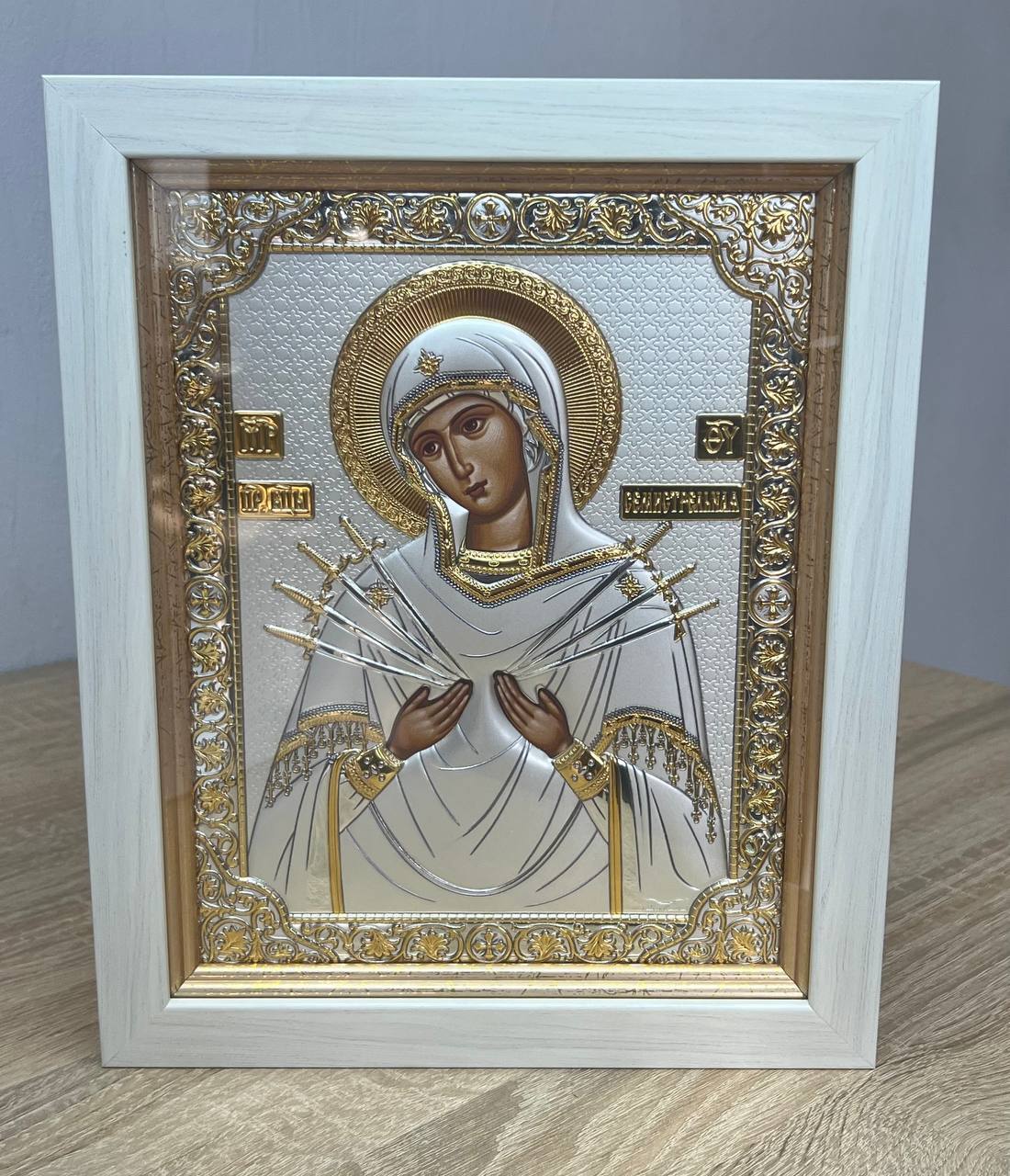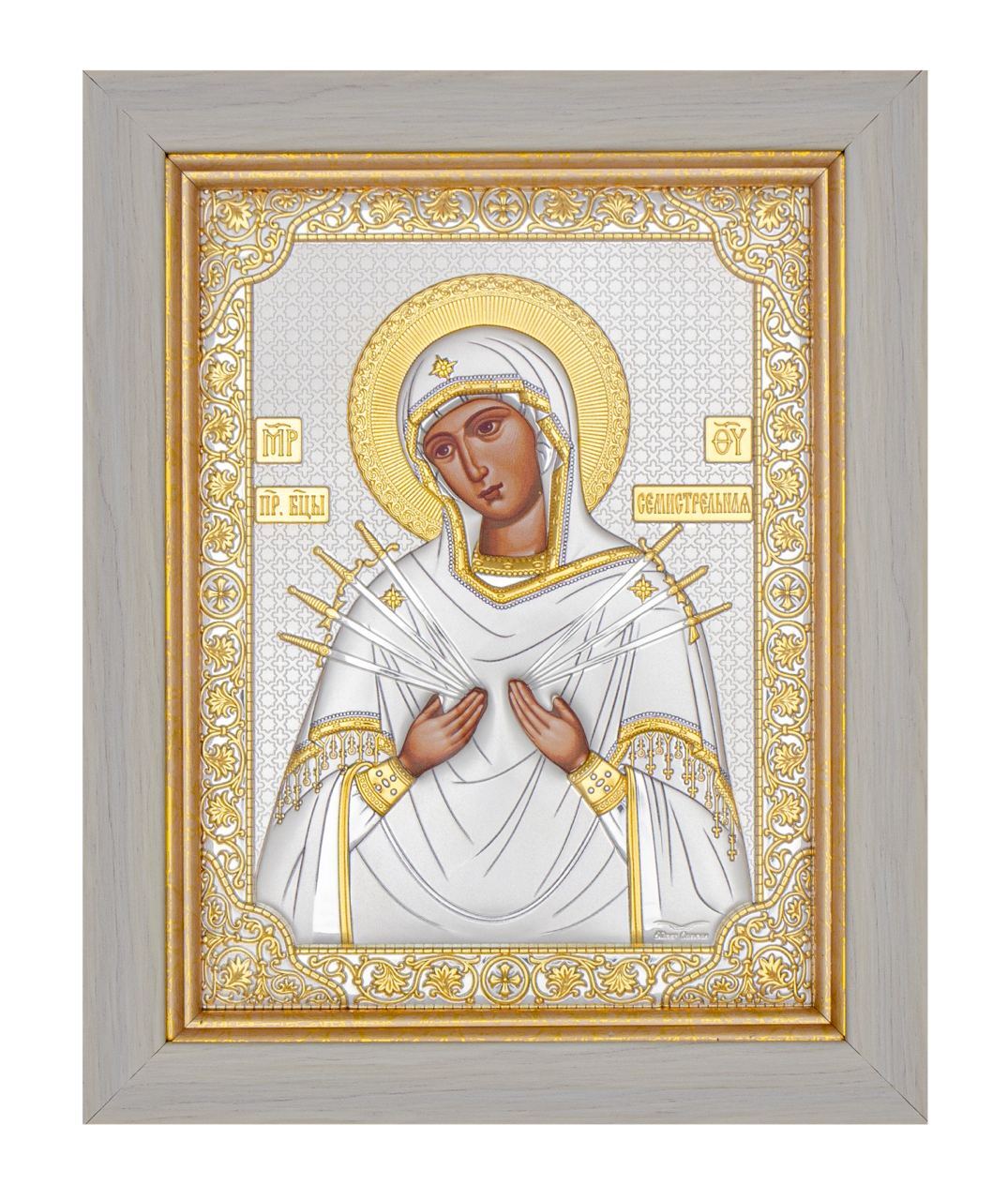 Семистрельная БМ, икона прямоугольная в рамке под стеклом, белое дерево 232х280мм серебряная Греческая.